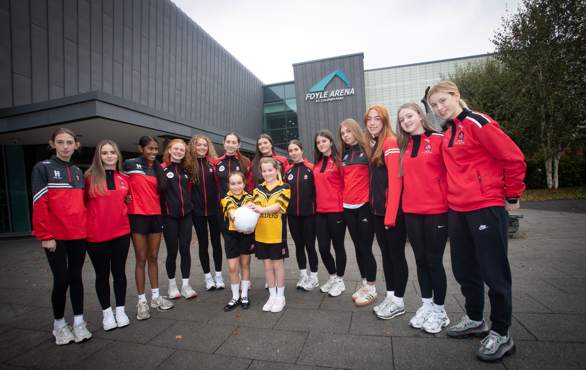 Two pupils from Model Primary School who took part in Friday's launch pictured with members of the County Derry Ladies Under Age Panel at the Foyle Arena. (Photos: Jim McCafferty Photography)