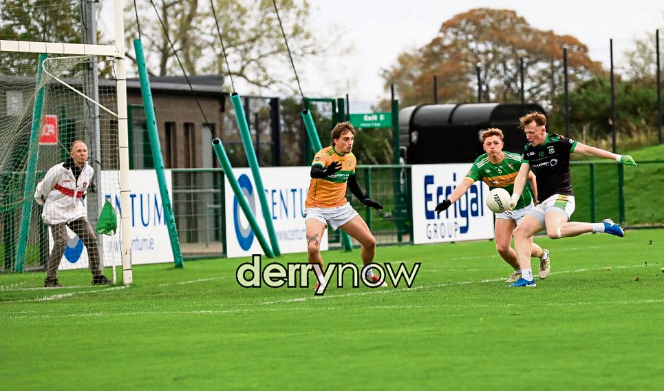 Glenullin’s Cillian Bradley prepares to kick the ball to take a point against Foreglen.