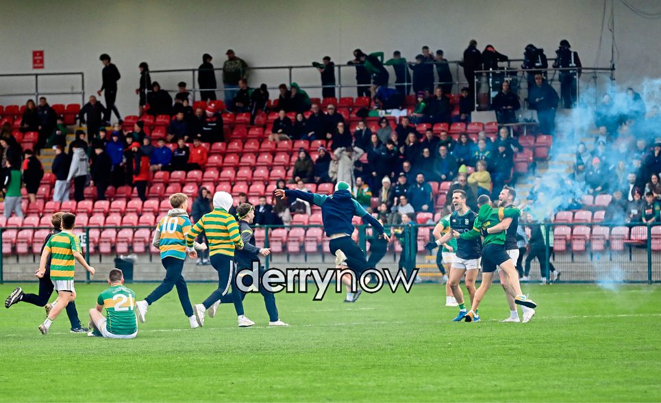 Fans race on to the pitch in celebration of Glenullin’s victory over Foreglen.