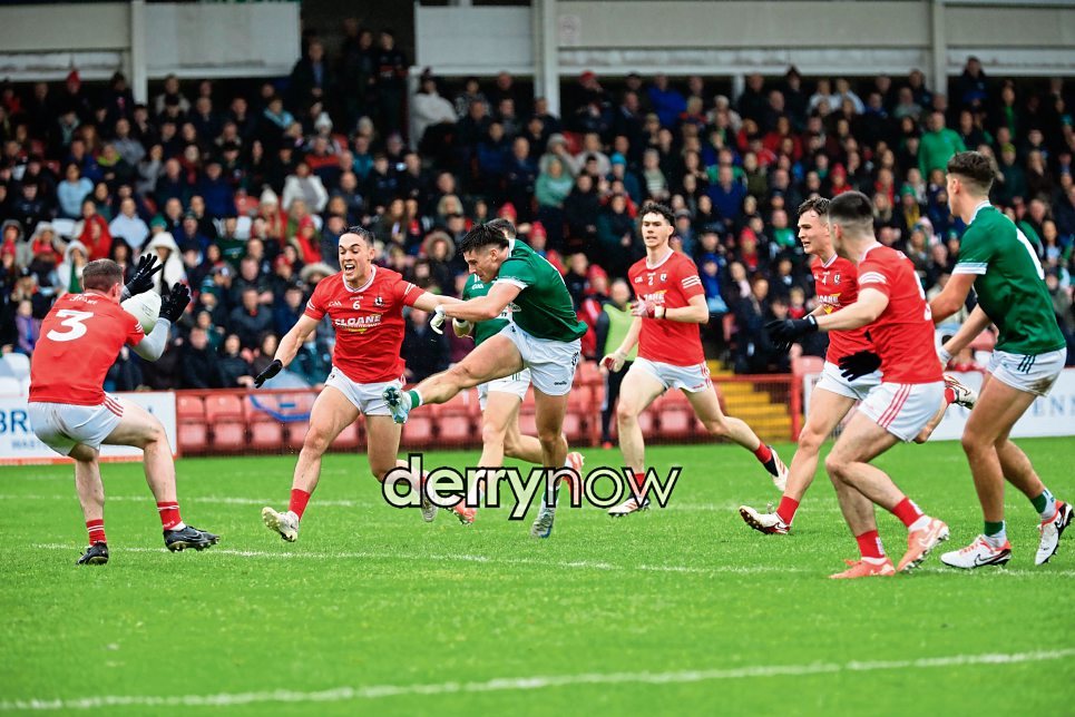 Newbridge’s Conor Doherty blasts the ball towards Magherafelt’s goal.