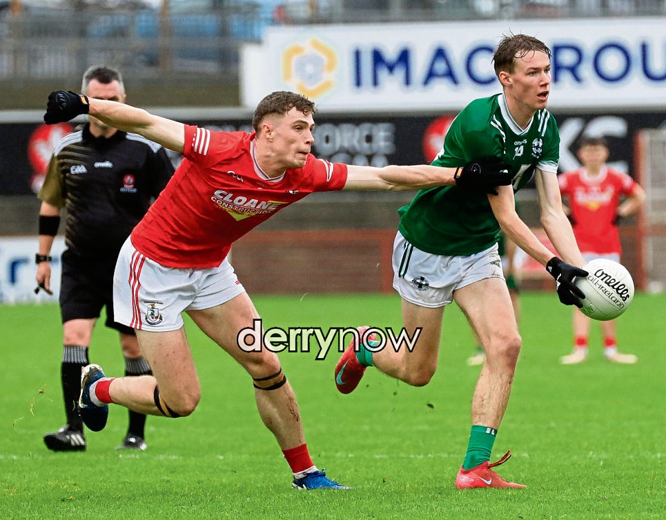 Magherafelt’s Eoin McEvoy attempts to block Newbridge’s Patrick McMullan moving forward.