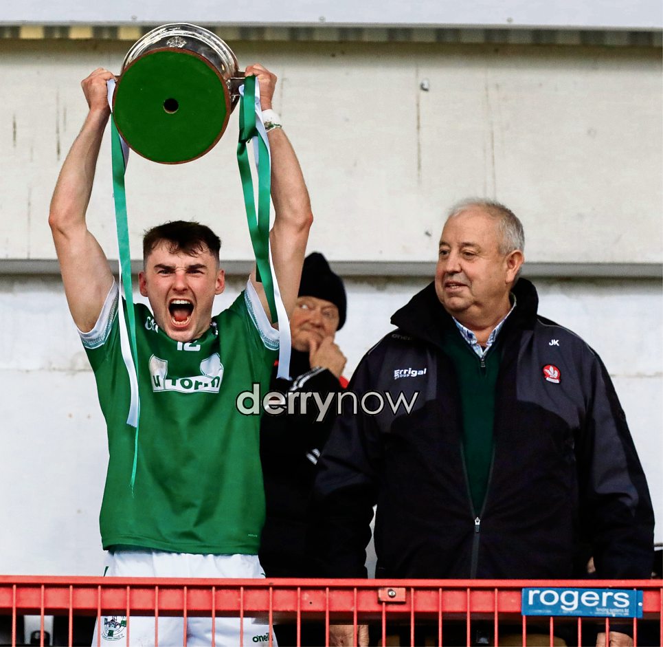 Newbridge’s captain Conor McAteer lifts the cup in celebration.
