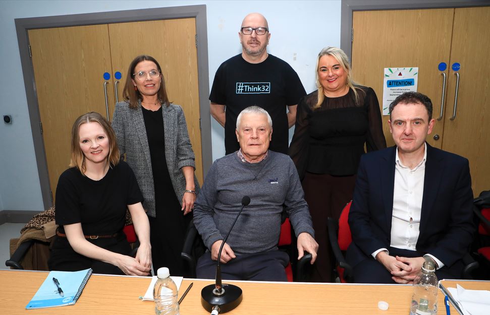 Seán Nash (standing), event organiser with the panel of speakers at the #Think 32 Irish Unity debate held in Galliagh Community Centre. From left, are Claire Mitchell, political writer and researcher, Catherine Pollock, chairperson, Davy Adams, former Loyalist, Cllr. Sandra Duffy and Prof. Colin Harvey. (Photos - Tom Heaney, nwpresspics)