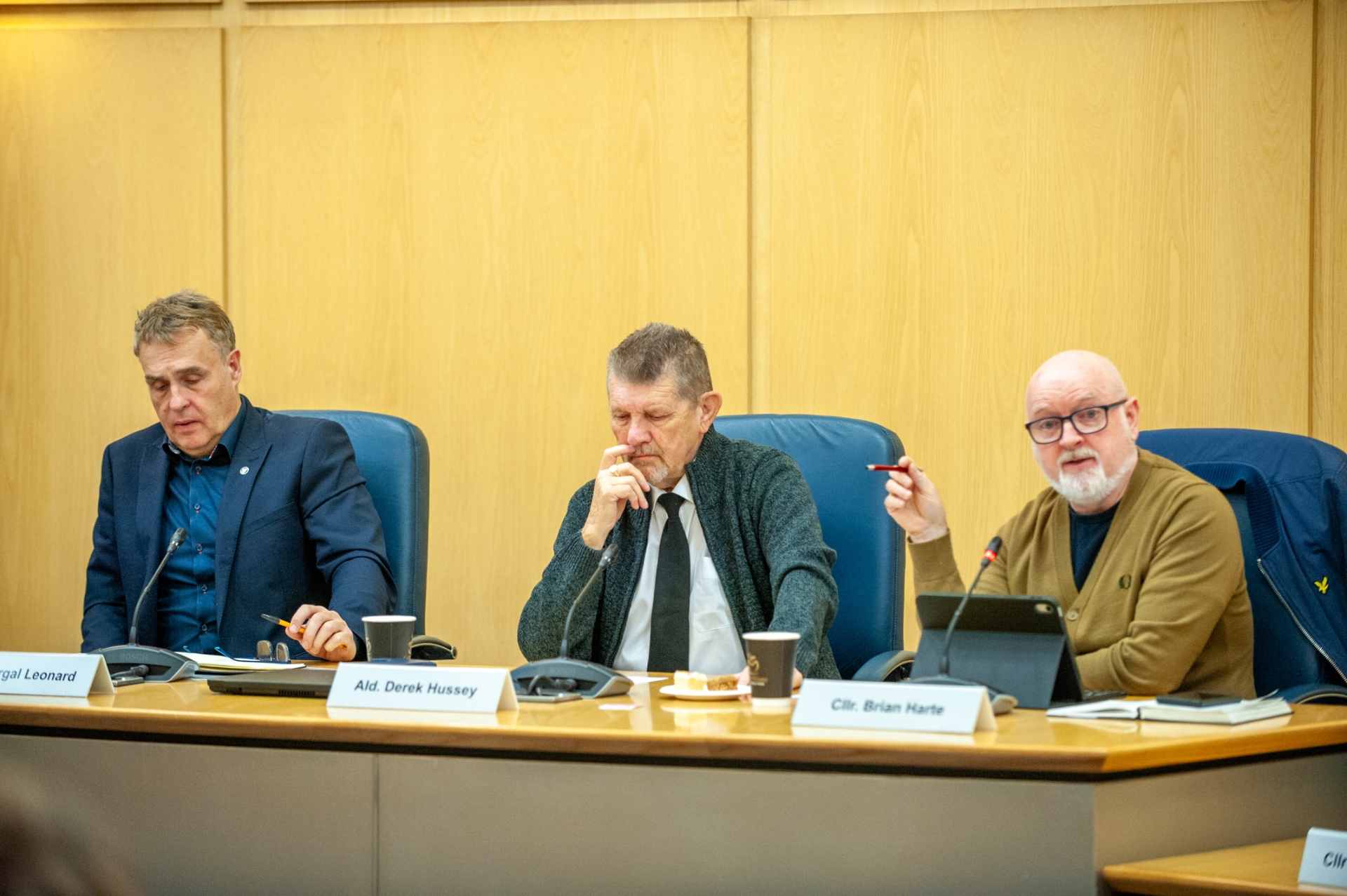 Councillors' Fergal Leonard, Derek Hussey and Brian Barney Harte taking questions from the students. (Photo: Raymond McCarron)
