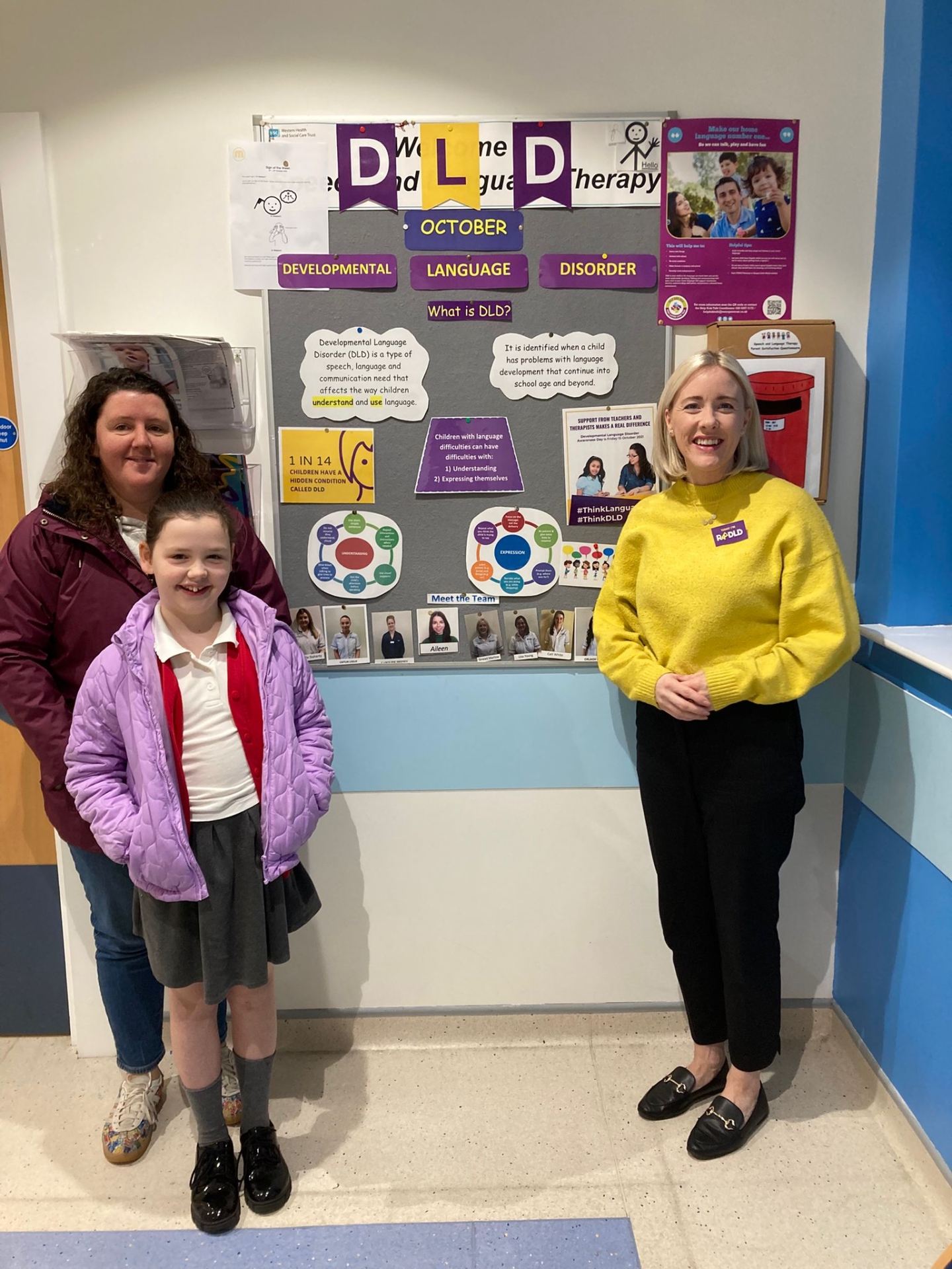 Service users Jamie and Lottie with Sinead Marlow, Speech and Language Therapi, wearing DLD colours in Waterside Health Centre