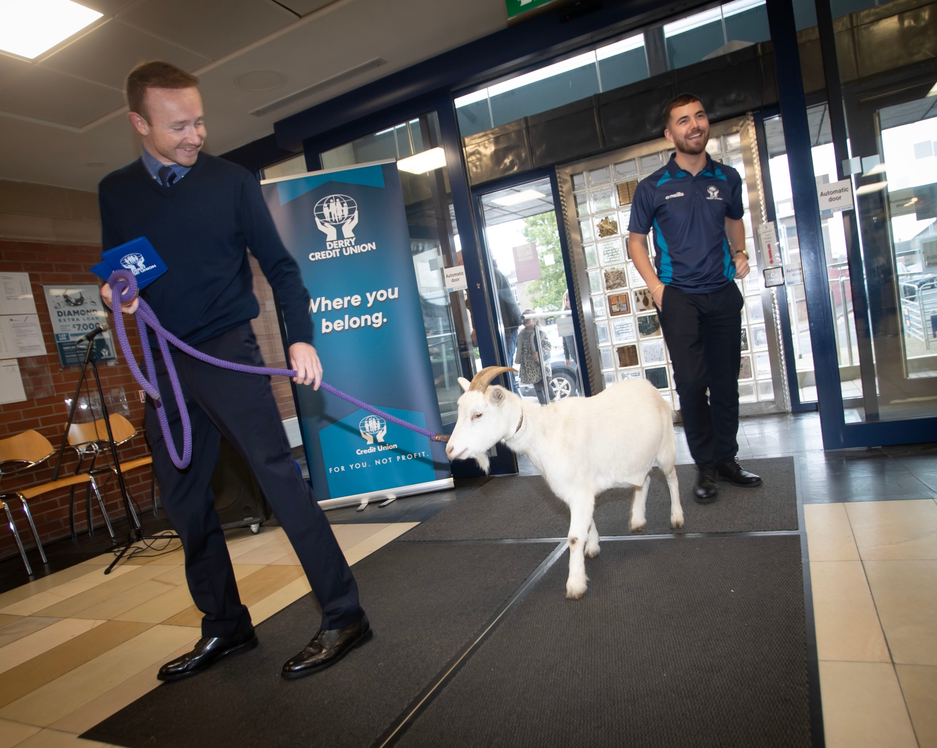 INTERNATIONAL CREDIT UNION DAY. . . . 'Sadie' The Goat shows anyone can save at Derry Credit Union, as they celebrate International Credit Union Day on Saturday last. Included in photo are Derry Credit Union staff members Ciaran McCormick and John Sheerin. (Photos: Jim McCafferty Photography)