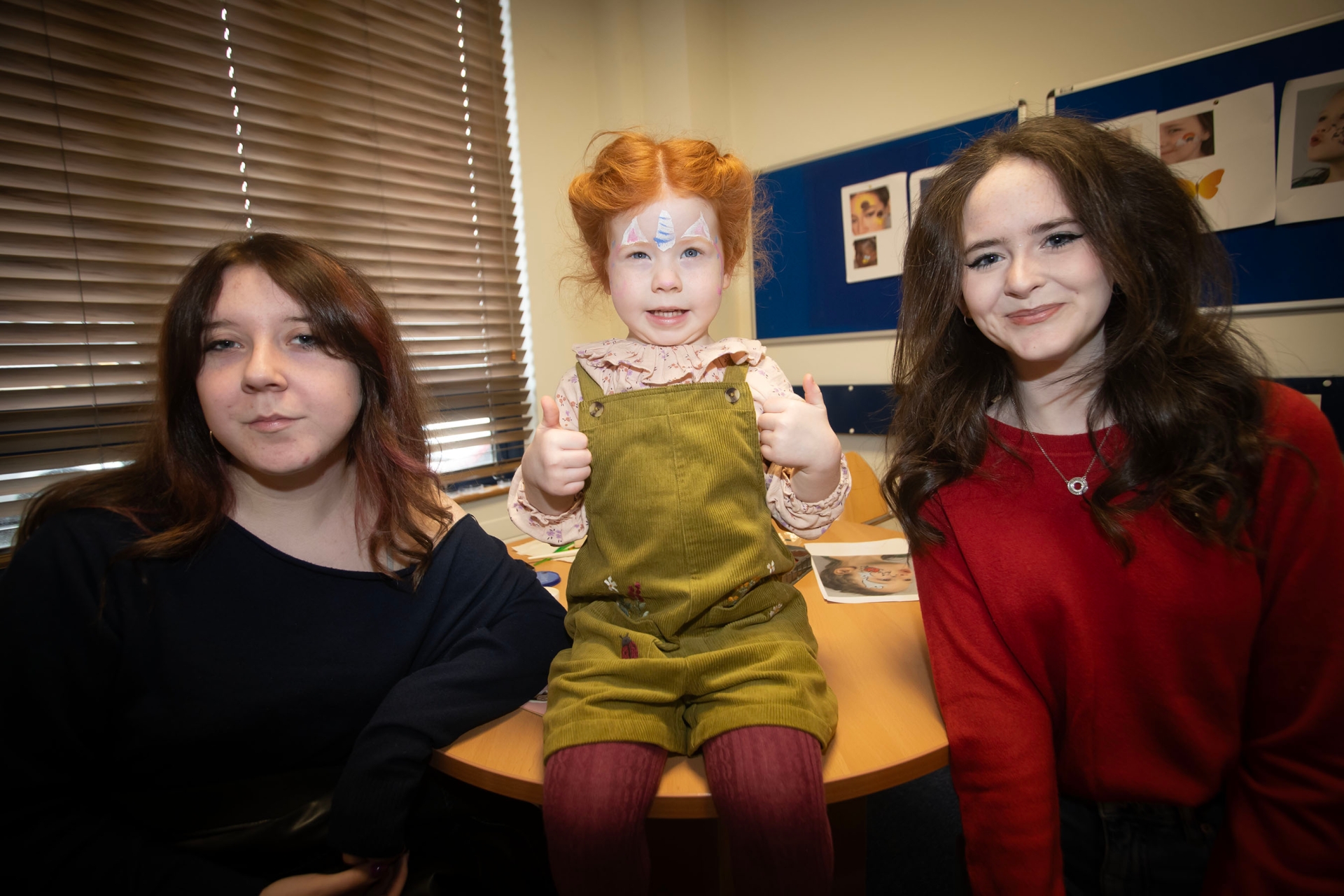 Facepainters Ellie McCourt and Lucy Harrigan pictured with 4 years old Ellen Quigley, delighted with her new face painting on Saturday at Derry Credit Union.