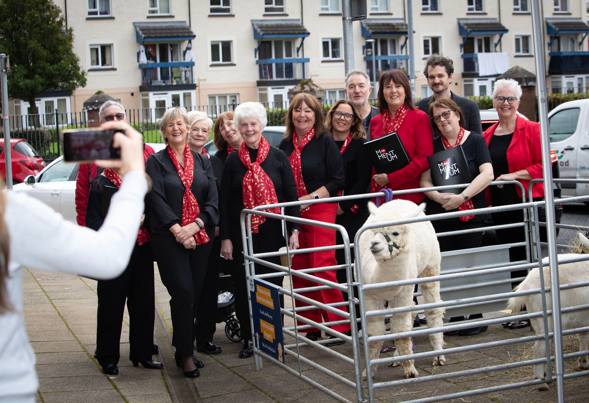 The Momentum Choir, who performed at Derry Credit Union during Saturday's celebrations pictured getting their photo taken with 'Sadie' The Goat.