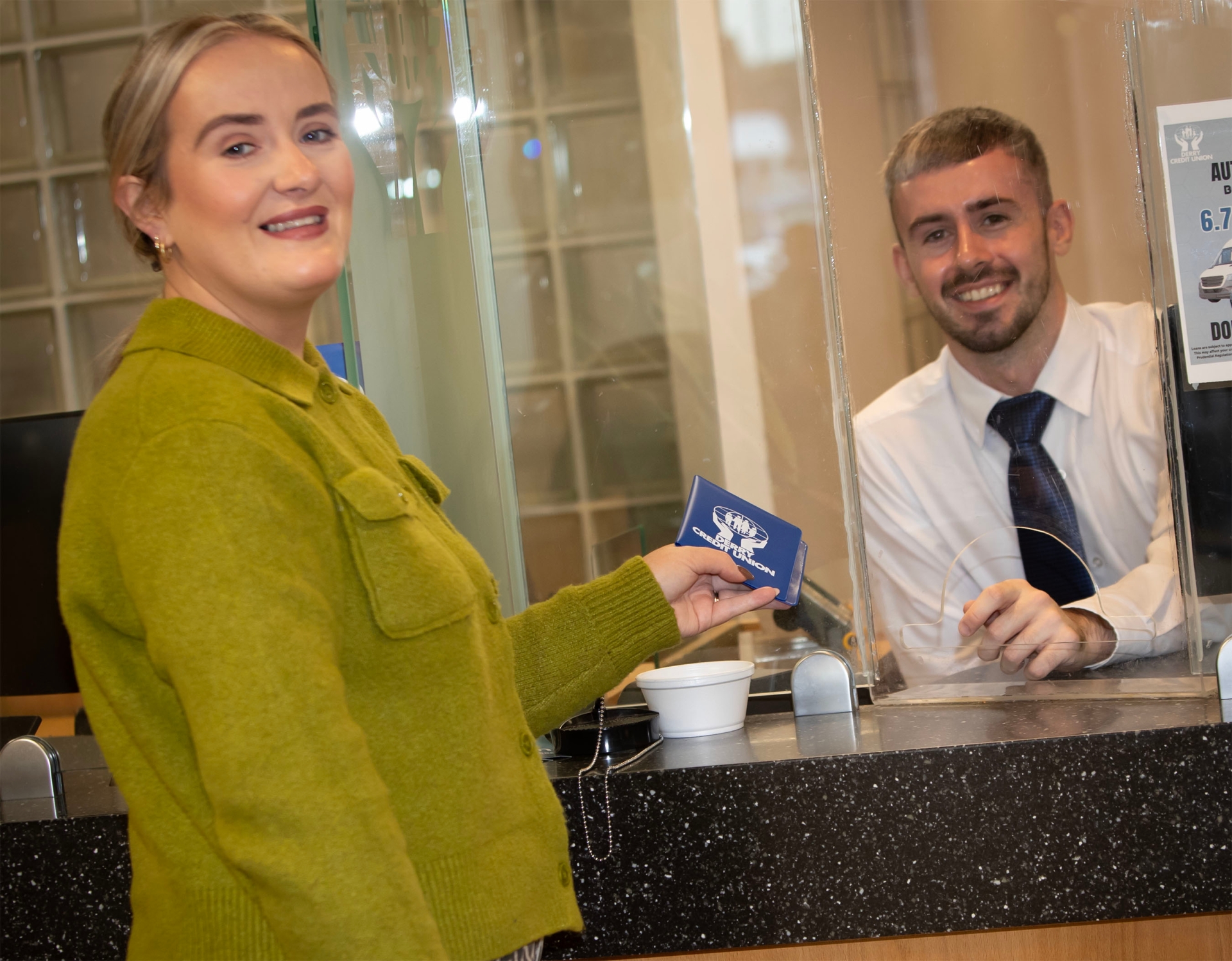 Leanne Totton handing over her Credit Union book to Feargal Reid during her visit to Saturday's International Credit Union Day celebrations.
