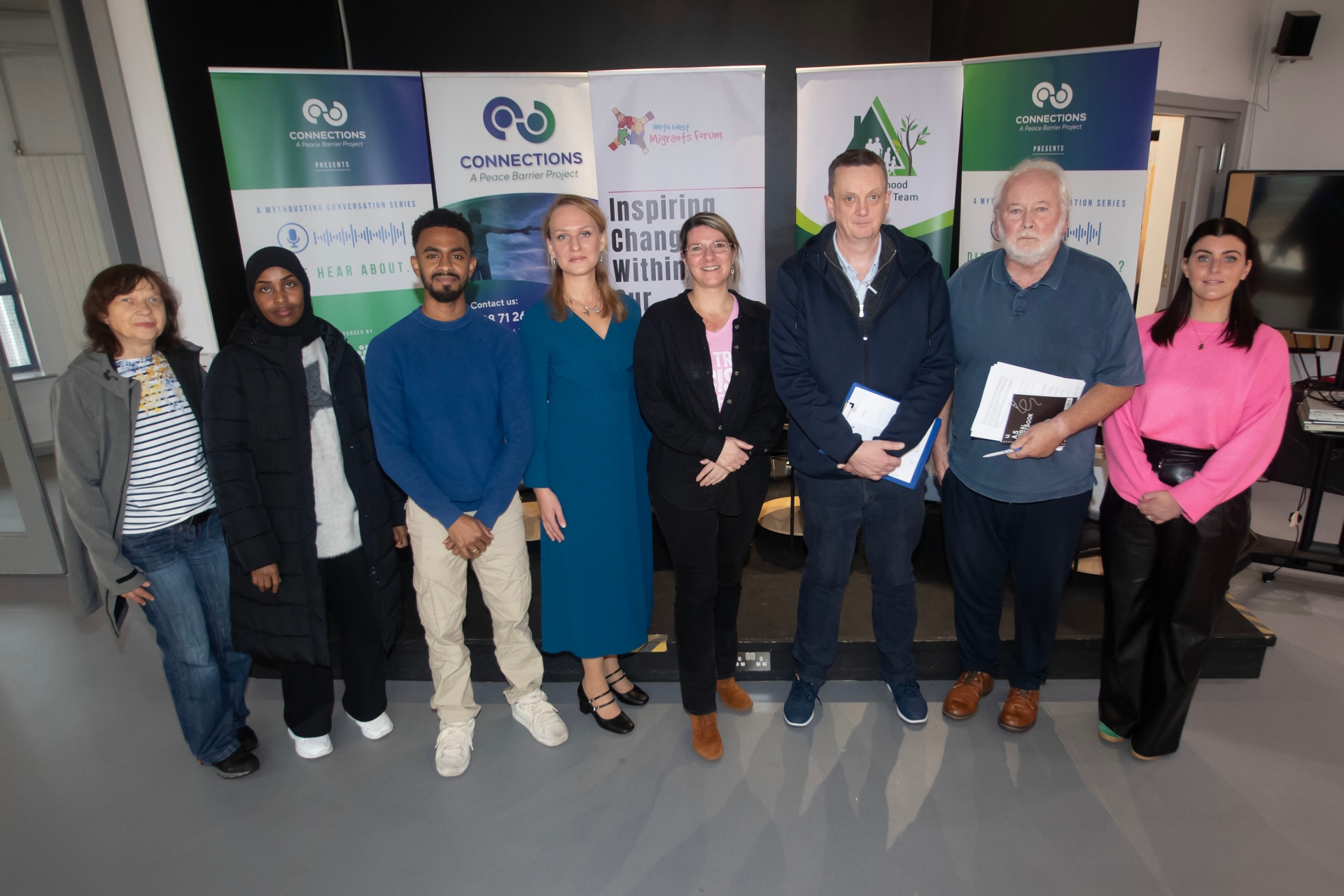 Group pictured at 'Did Ye Hear About. . . .? Conversations at the Gasyard. From left, Deegohaji, Mohammead Adel, Anastasia Shevchenok, Gaelle Gormley, Welfare and Integration Officer, NW Migrants Forum, Conor Sharkey, Press Officer, NW Migrants Forum, Pat McArt, event host and chair, and Rachel Mullan-Carlin. (Photos: Jim McCafferty Photography)