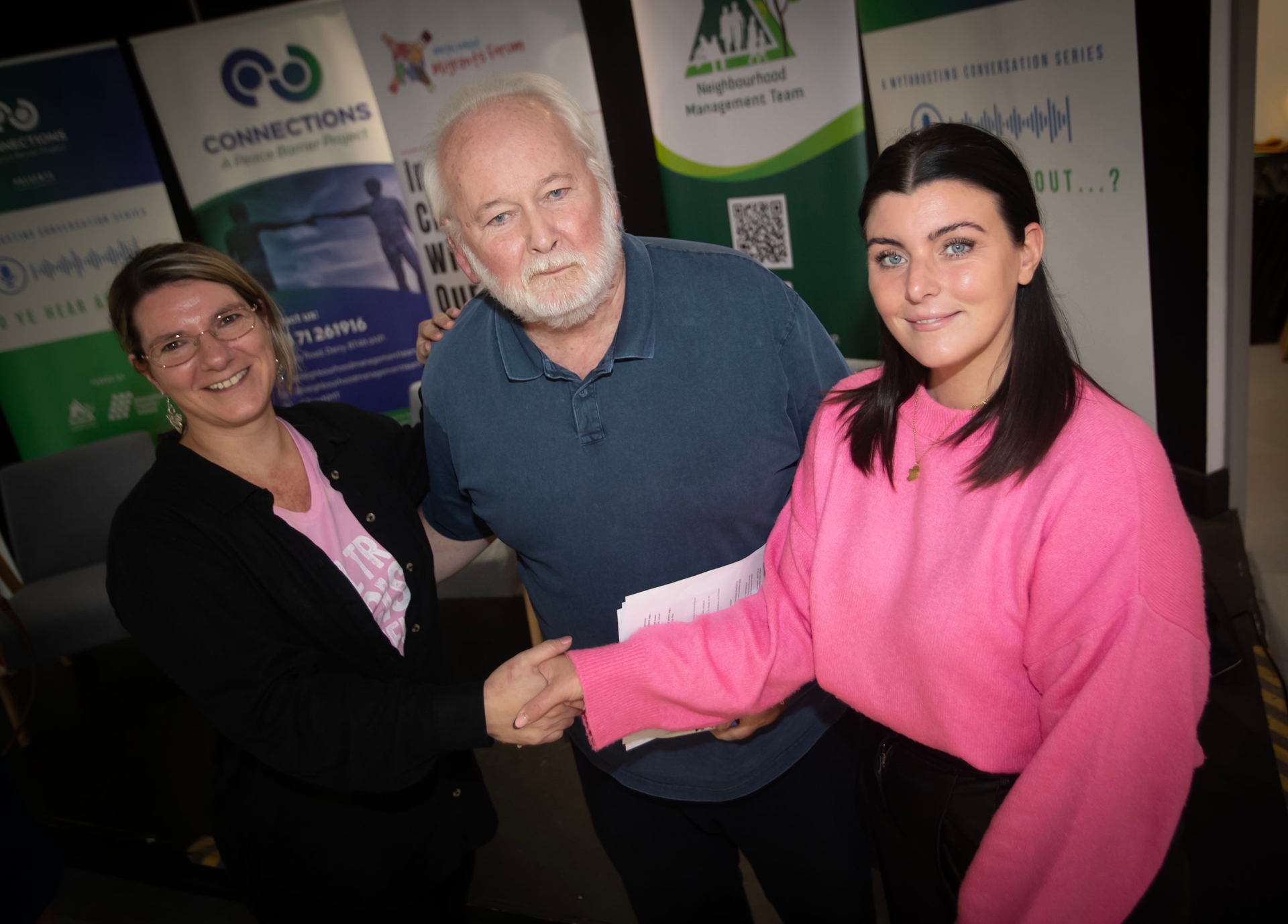 Rachel Mullan-Carlin welcoming Gaelle Gormley, speaker and Welfare and integration Officer, North West Migrants Forum to Tuesday's 'Did Ye Hear About. . . .? Conversations at the Gasyard. Centre is Pat McArt, chair.