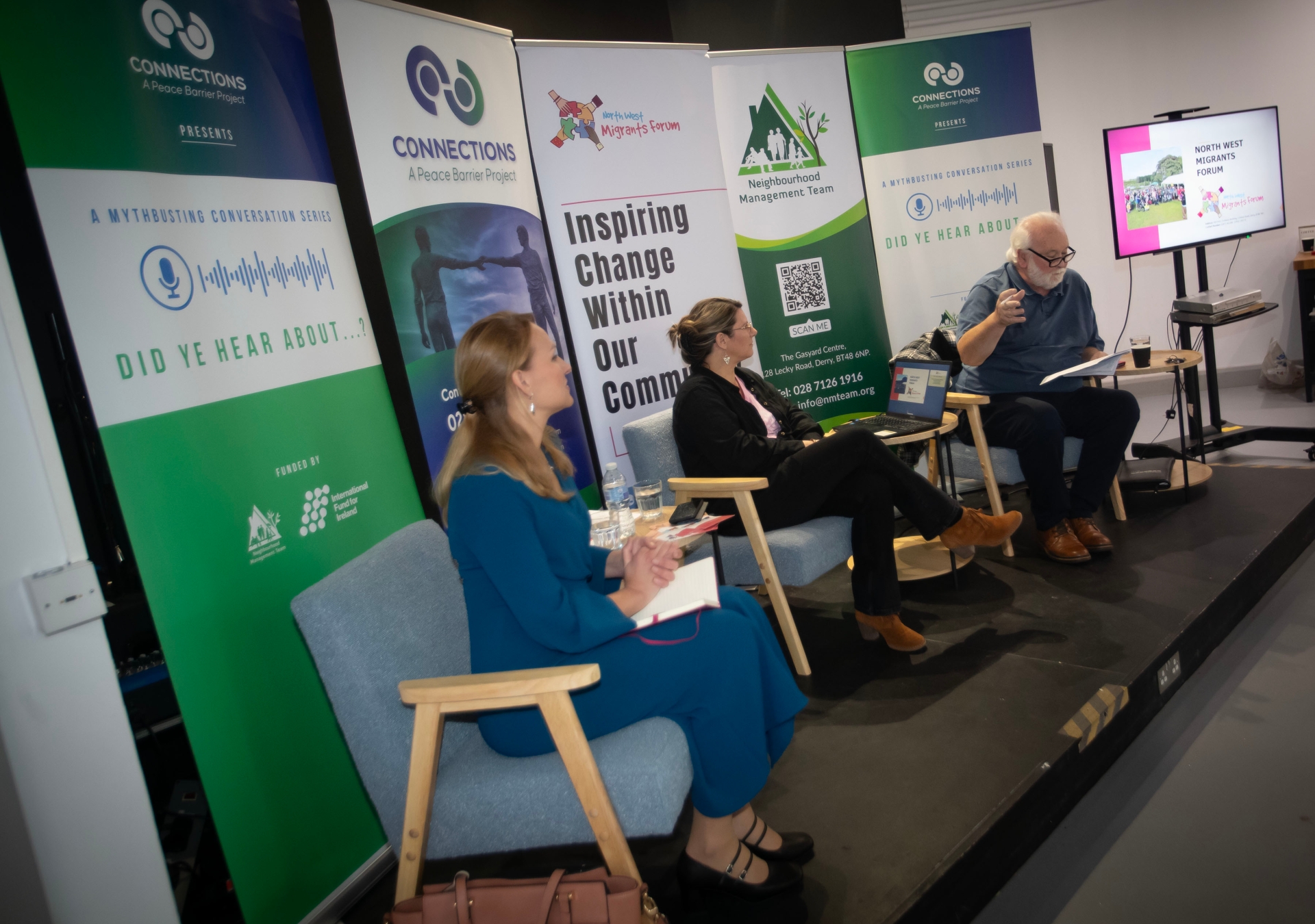 Pat McArt chairing Tuesday's 'Did Ye Hear About. . . .? Conversations at the Gasyard with Anastasia Shevchenko and Gaelle Gormley, Welfare and Integration Officer, NW Migrants Forum.