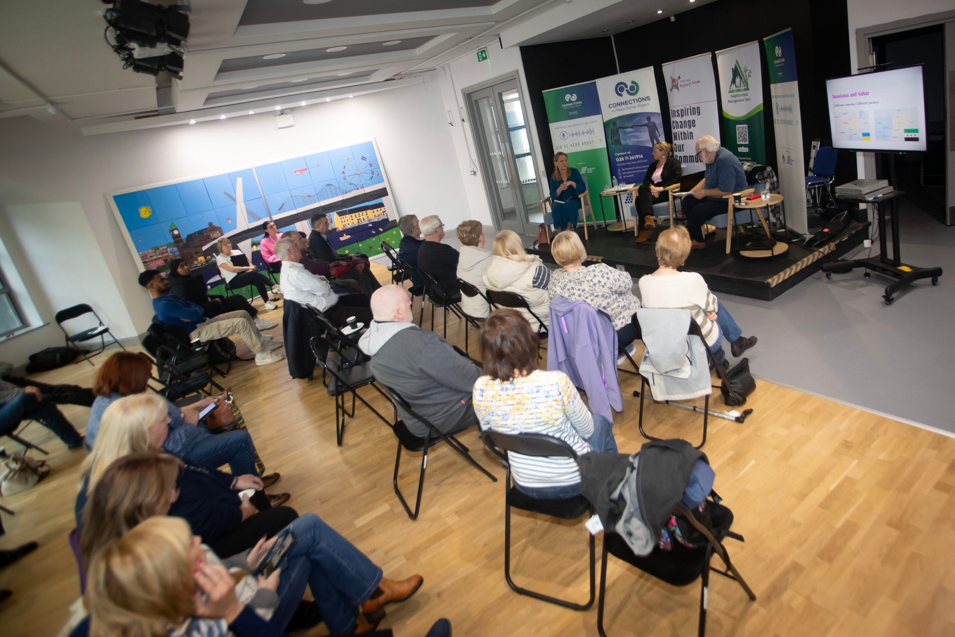 Pat McArt chairing 'Did Ye Hear About. . . .? Conversations at the Gasyard with Anastasia Shevchenko and Gaelle Gormley, Welfare and Integration Officer, NW Migrants Forum.