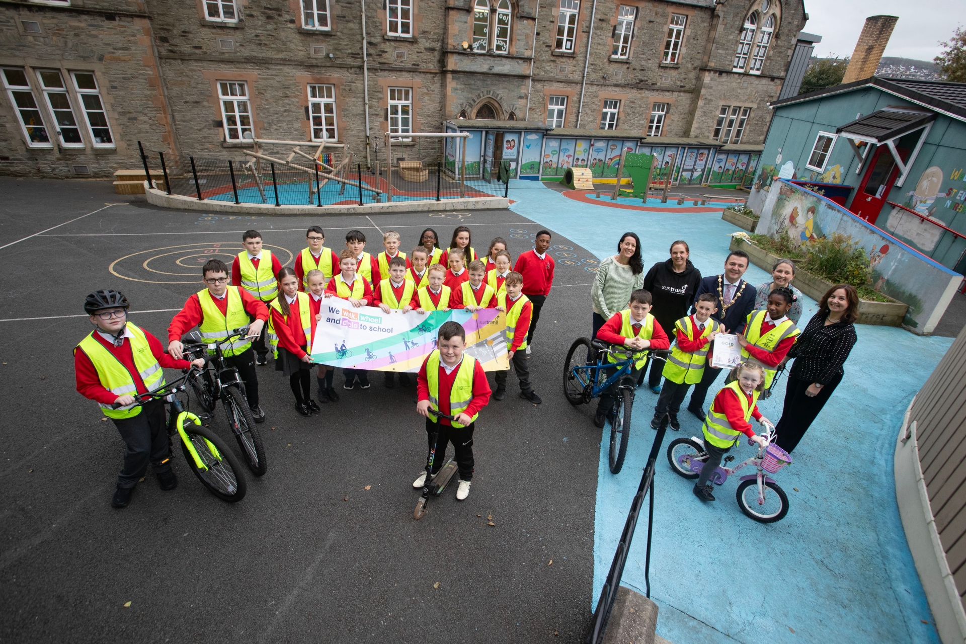 WALK WHEEL CYCLE TRUST GOLD AWARD. . . . .The Mayor of Derry City and Strabane District Council, Ruairi McHugh pictured at St. Eugene's Primary School on Friday last when the school received the prestigious Active School Travel Gold Award from the charity Walk Wheel Cycle Trust, (formerly Sustrans). Included are representatives from Wheel Cycle Trust, Mrs. Carol Duffy, Principal and Ms. Herron, teacher/co-ordinator. (Photos: Jim McCafferty Photography)