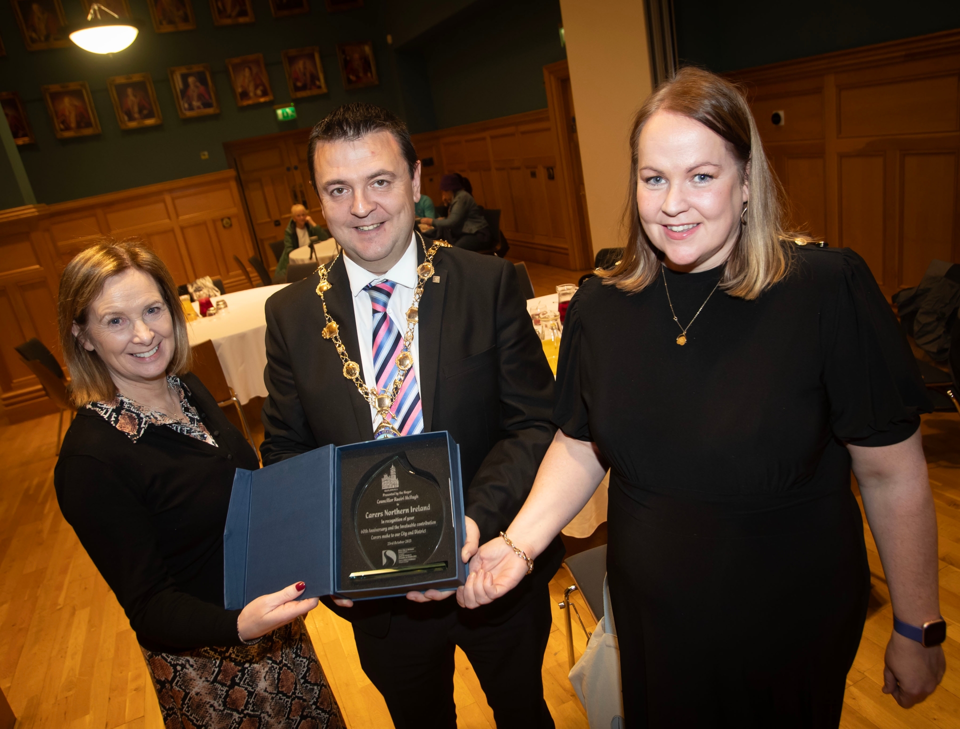 The Mayor of Derry City and Strabane District Council, Ruairi McHugh pictured making a special presentation to Geraldine McLaughlin, Carers Co-Ordinator, WHSCT and Jolene Cunningham, Resource Manager, Carers NI to mark the group's 60th anniversary, at a ceremony in the Guildhall on Thursday night last.