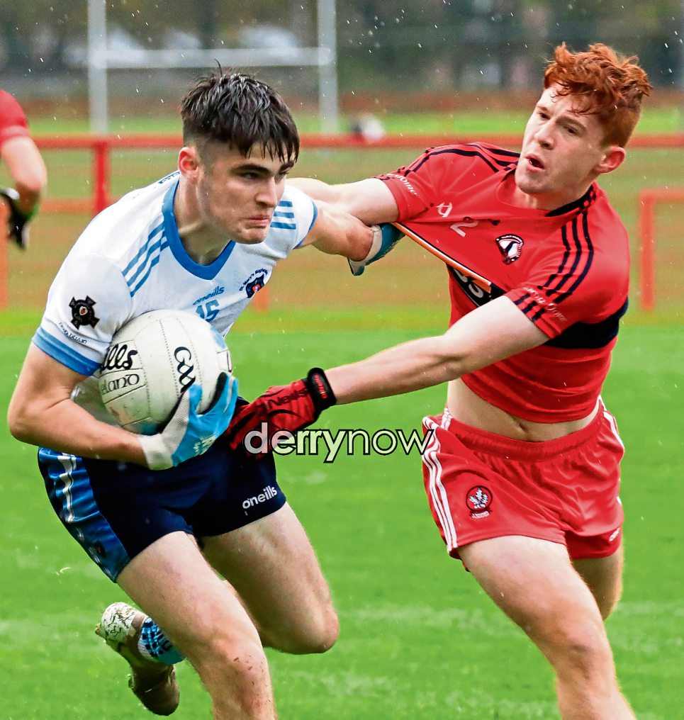 St. Mary’s Grammar School Magherafelt’s Shea McCann pulls away from Cathair Doire Fionn McGilloway.