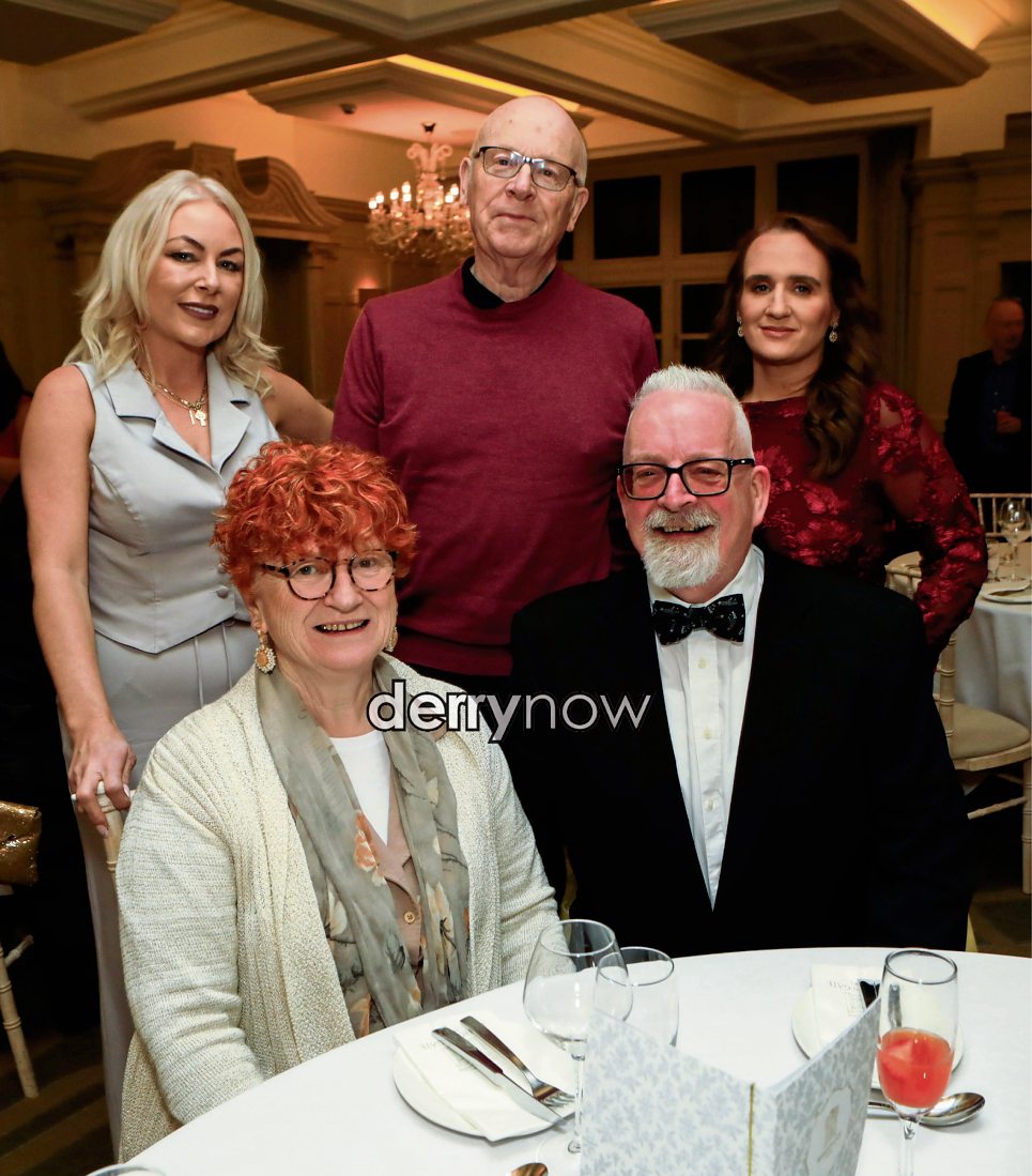 Seated are Charlie and Anne McDaid, with standing from left, Jeannie Glenn, Joe Martin and Georgina Lavey at the 30th anniversary Greater Shantallow Partnership anniversary dinner.