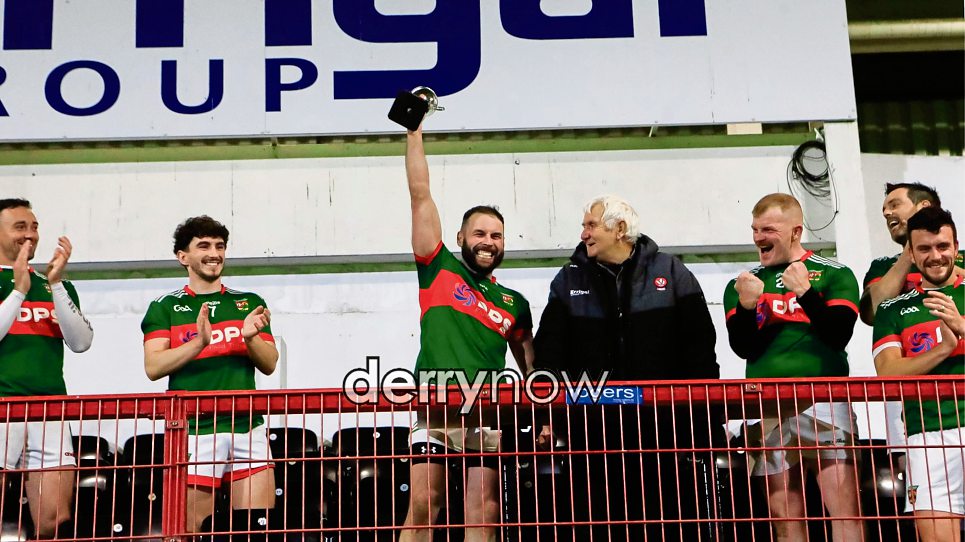 Slaughtmanus captain Jason Ferguson lifing the GAA GAA Junior Reserves Championship in victory over Sean Dolans.
