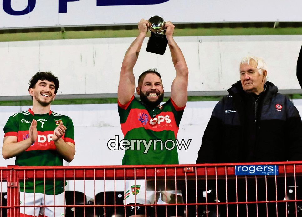 Slaughtmanus captain Jason Ferguson lifting the GAA GAA Junior Reserves Championship on Friday night.
