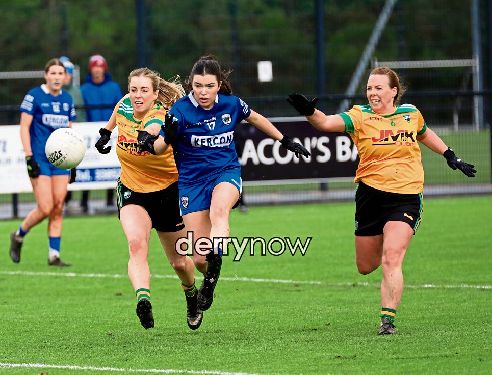 Claudy ladies’ Leah White boots the ball forward.