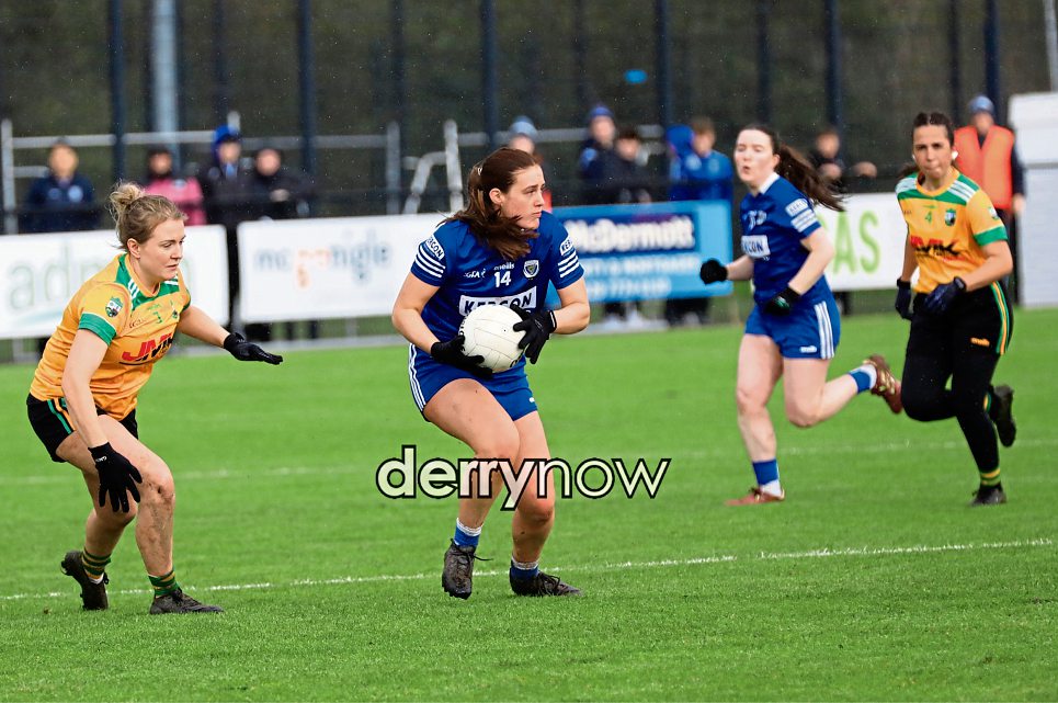 Claudy ladies’ Cait Quigley looks for support against Lissummon in the AIB Junior Club Championship quarter final held at John Mitchel’s GAC, Claudy.