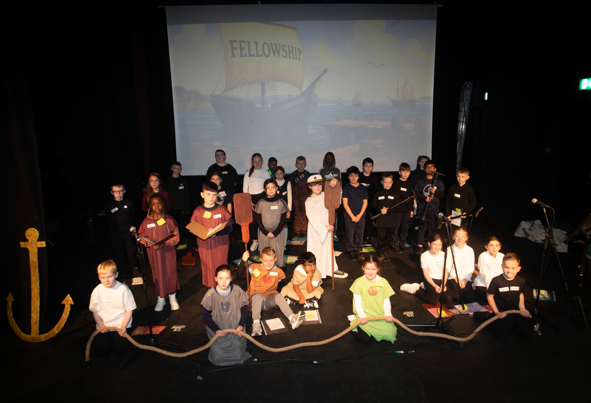 FELLOWSHIP!. . . . .The cast of the Churches Trust's 'The Voyage of the Fellowship' made up of pupils from the Long Tower and Fountain PS pictured on stage at the Playhouse, Derry on Friday morning. (Photos: Jim McCafferty Photography)