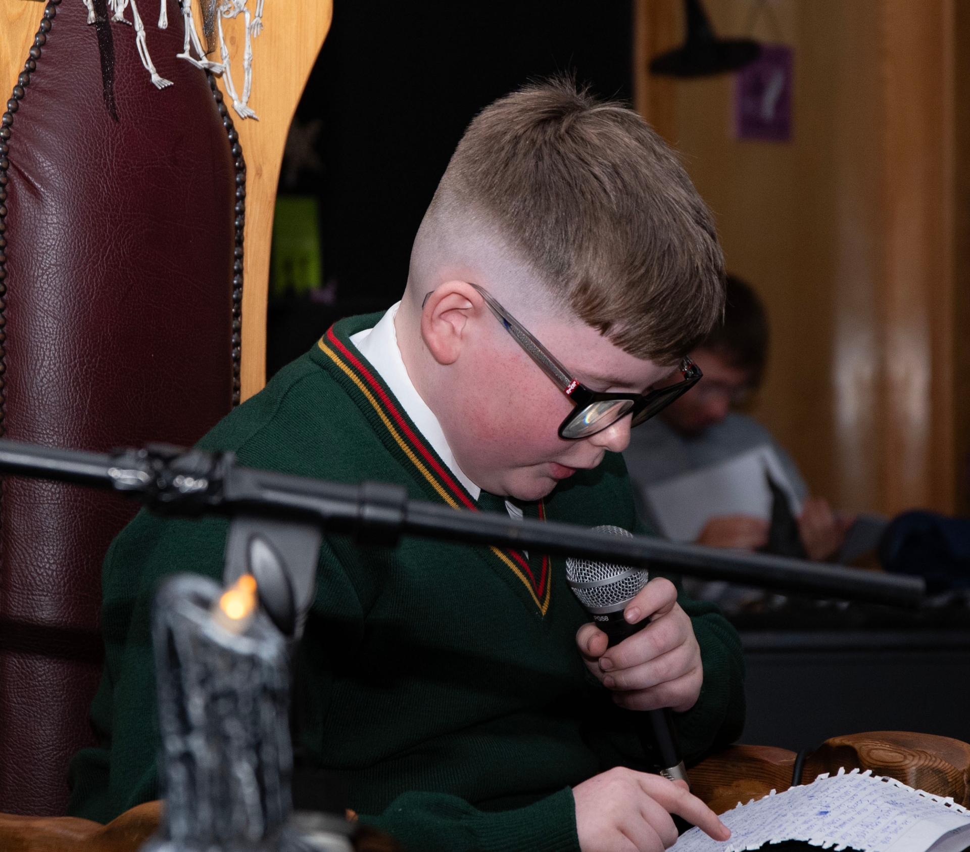 Year 8 pupil Christopher entertaining the audience with his spooky story on Thursday last at St. Joseph's Boys School.