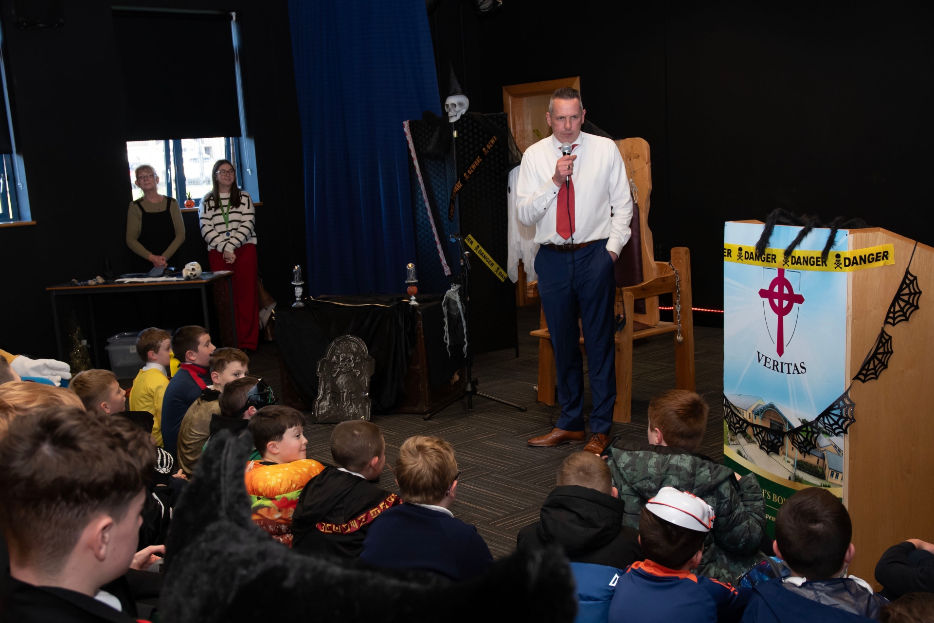 Mr. Peter Smith setting the atmosphere for Spooker Prizegiving at St. Joseph's on Thursday last.