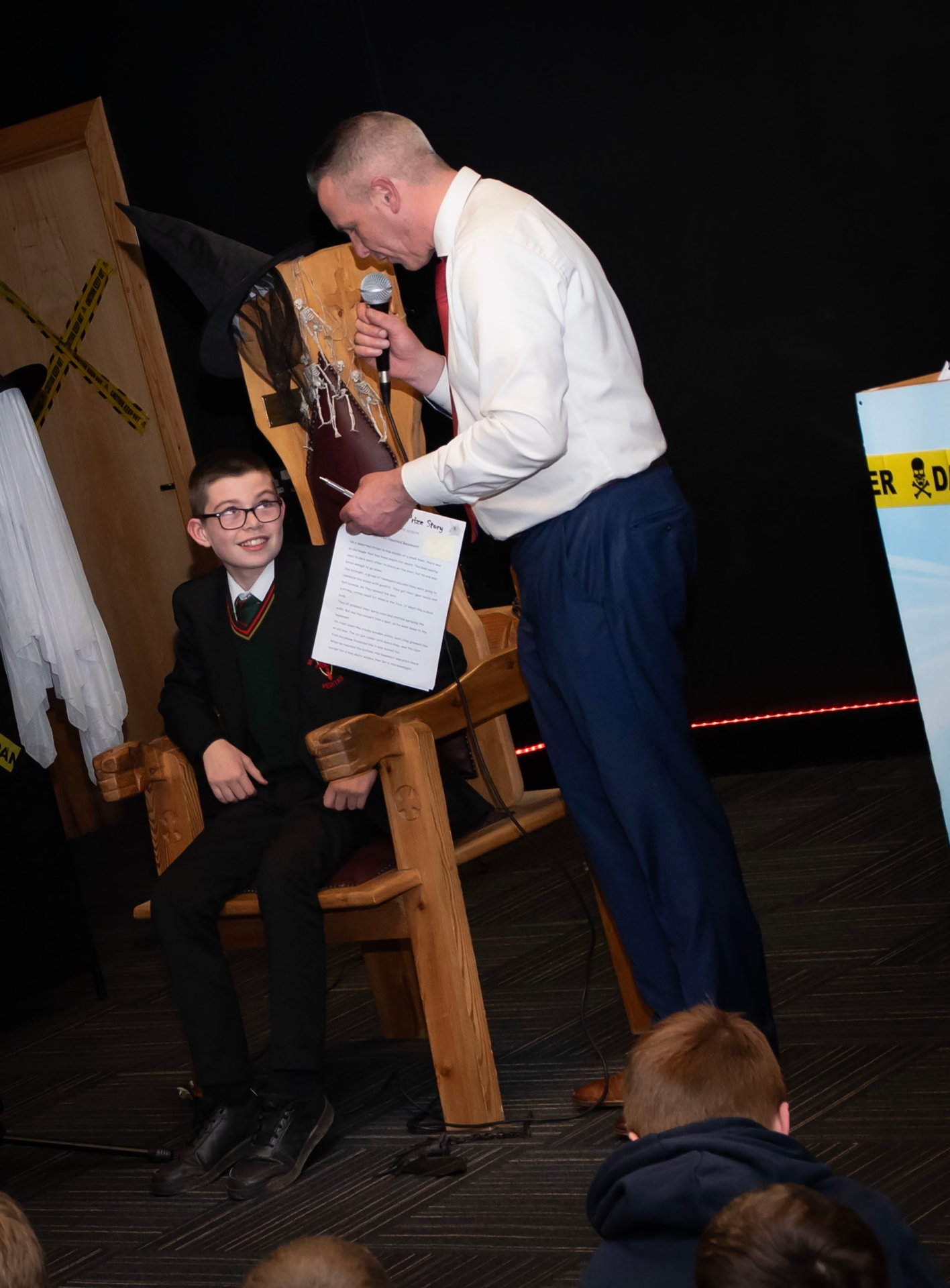 Year 8 student Paul discussing the location, characters and plot for his scary story with Mr. Smith.