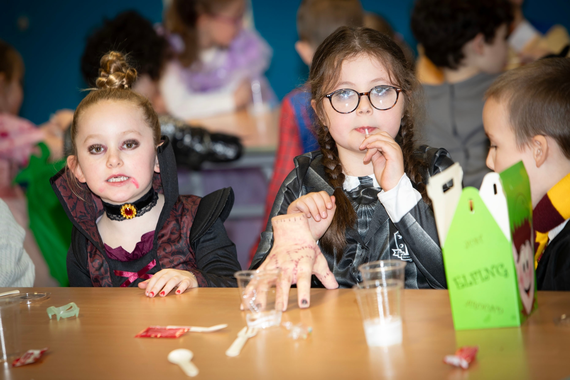 Two of the more colourful younger students pictured in the school canteen on Friday.
