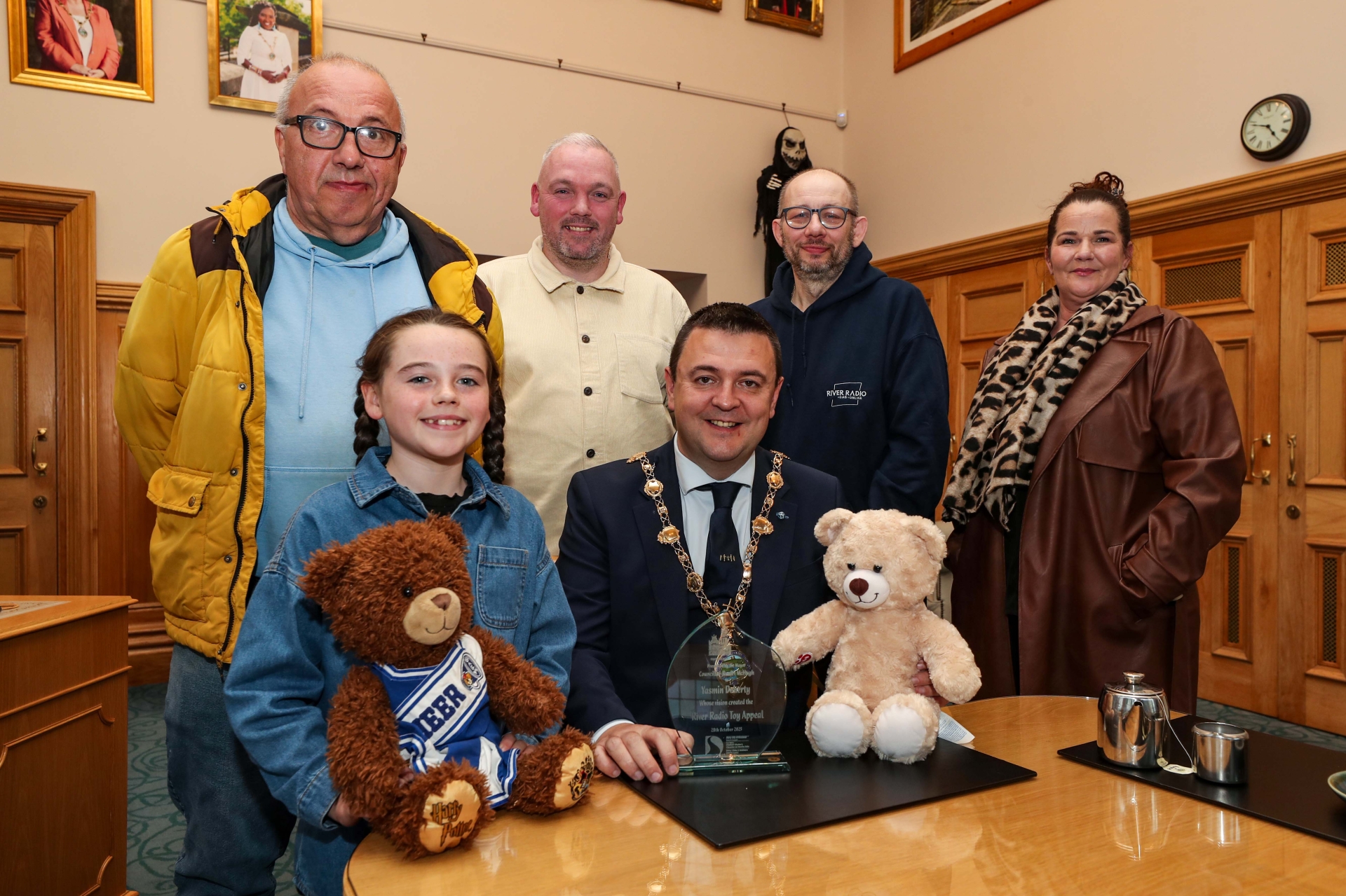 The Mayor of Derry & Strabane, Councillor Ruairi McHugh with 9 years Yazmin Doherty, Founder of the River Radio Toy Appeal, at a reception in the Guildhall. Included, from left Steve Marshall, Gerry Doherty, Keith Wright and Debbie Lamberton from River Radio.
