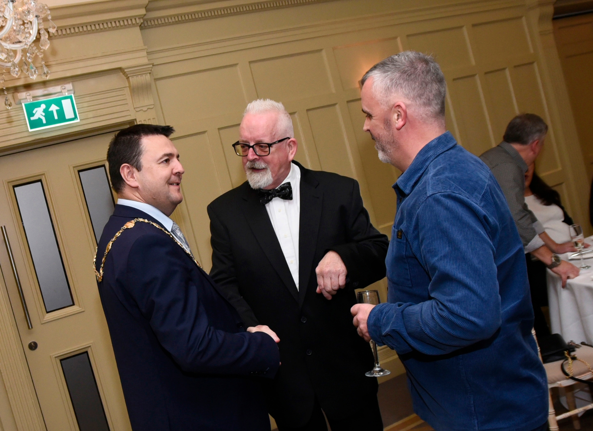 Mayor Ruairi McHugh in conversation with Charlie McDaid, founding member, GSAP and Rory McParland, manager, GSAP at Friday's 30th anniversary celebrations.