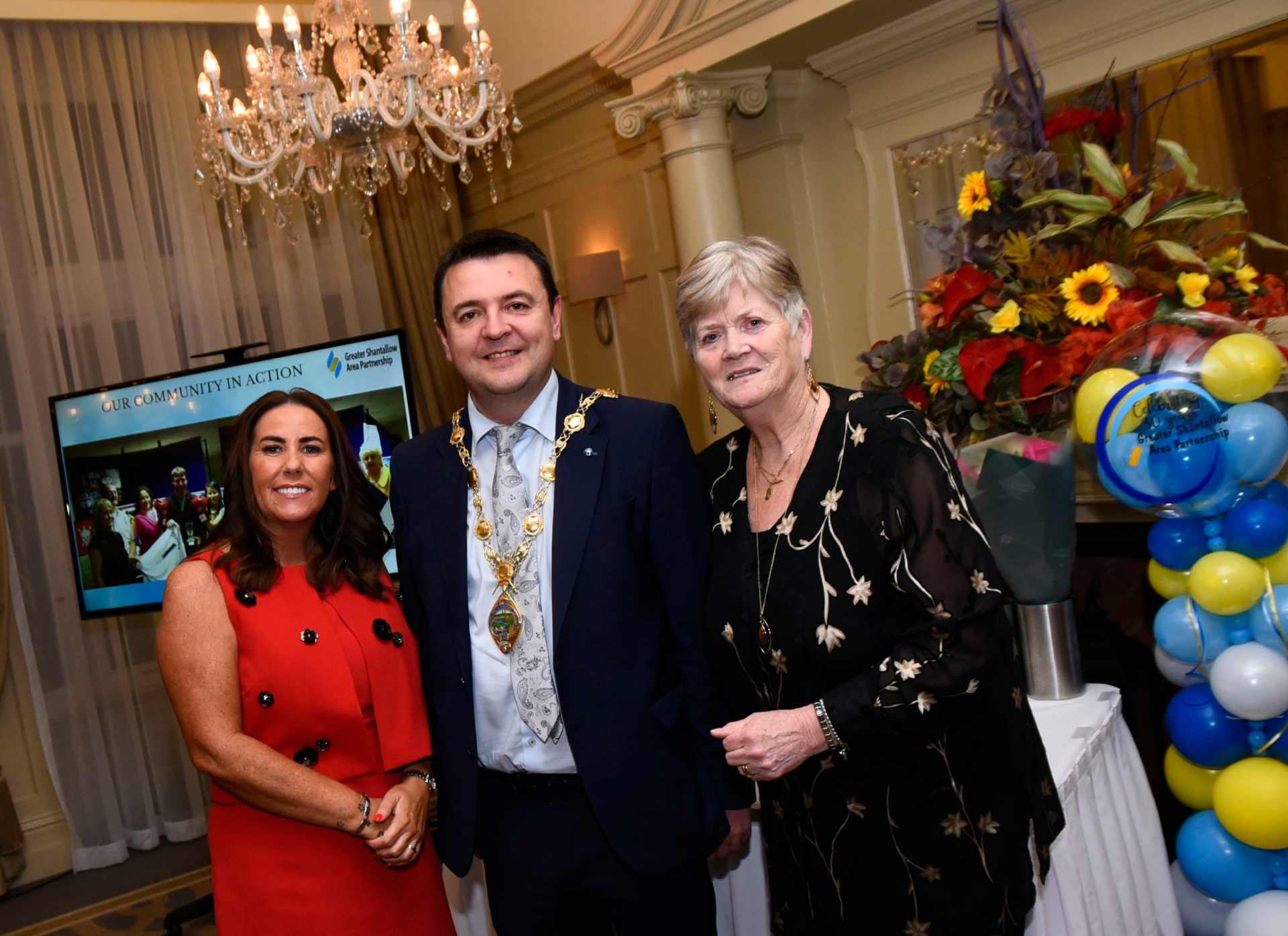 The Mayor of Derry City and Strabane District Council, Ruairi McHugh pictured with Nicola Mullan and Marie Gillespie at the Greater Shantallow Area Partnership's 30th anniversary celebrations in Bishop's Gate Hotel, Derry on Friday night last.