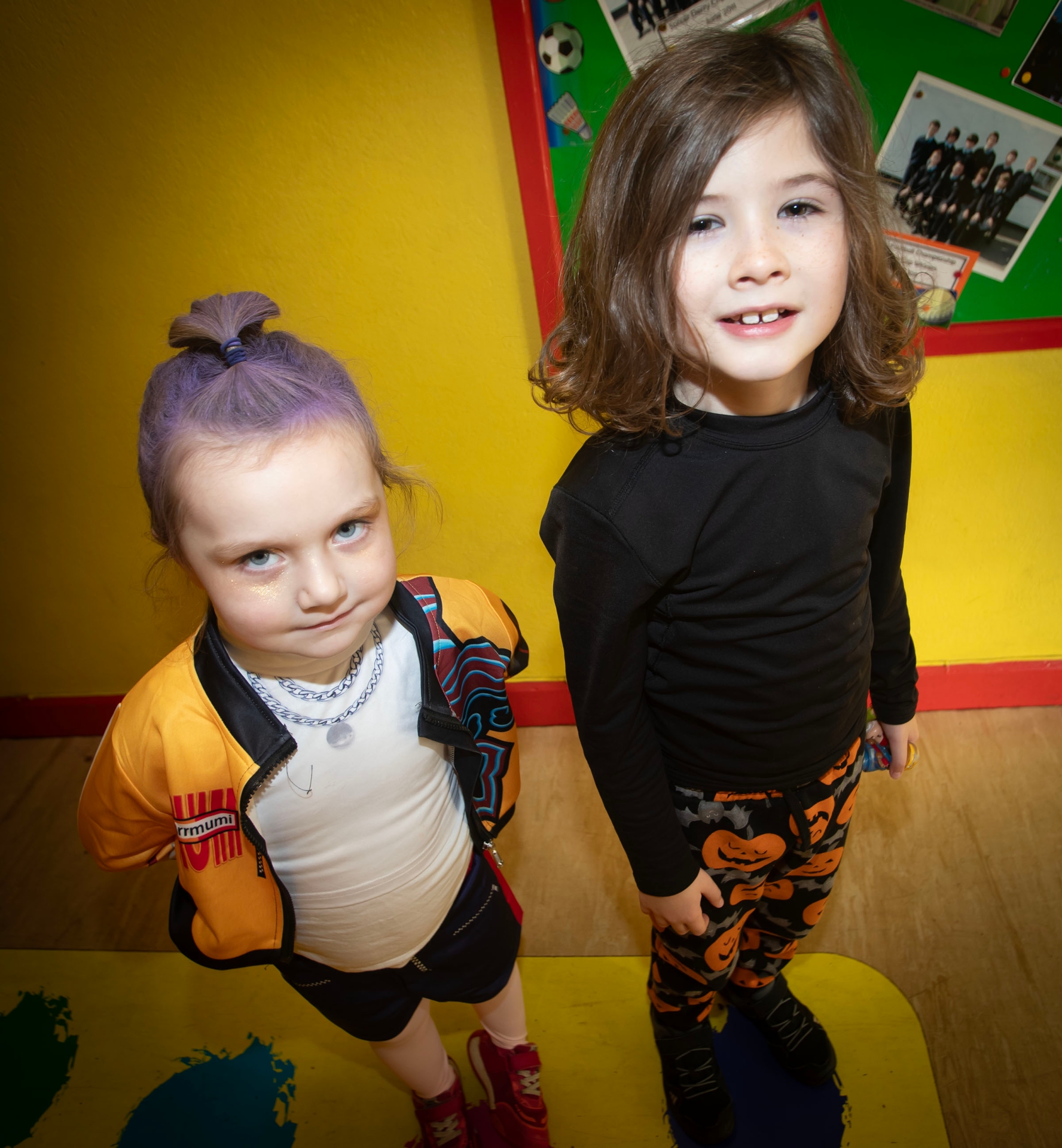 Hollybush PS pupils Luciana and Oisin pause on their way to the disco for a photo on Wednesday.