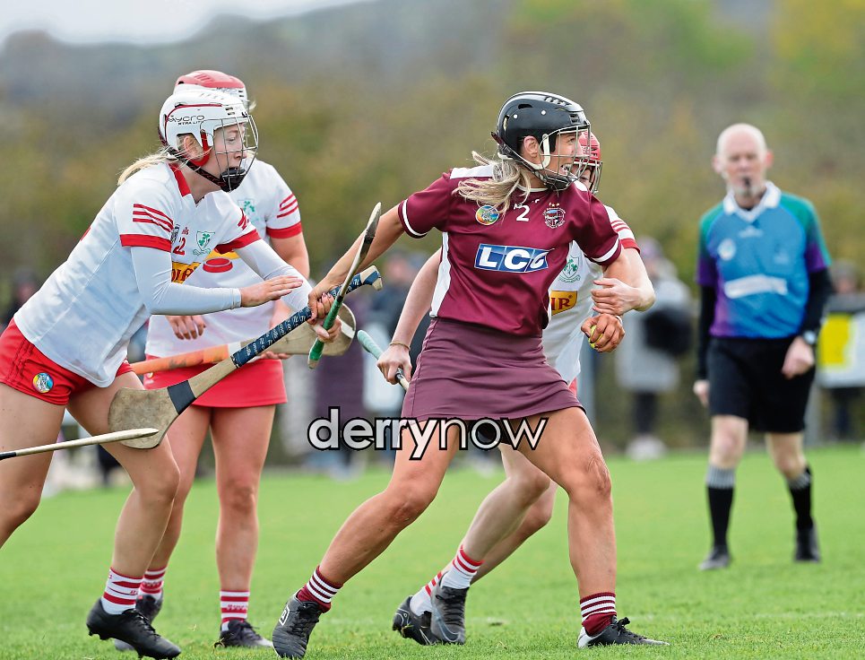 Slaughtneil Dervla McGuigan under pressure from Orlagh Laverty and Shanna Deery of Loughgiel during the Ulster Senior Camogie Championship semi final played at Slaughtneil on Sunday. (Photos: Margaret McLaughlin)