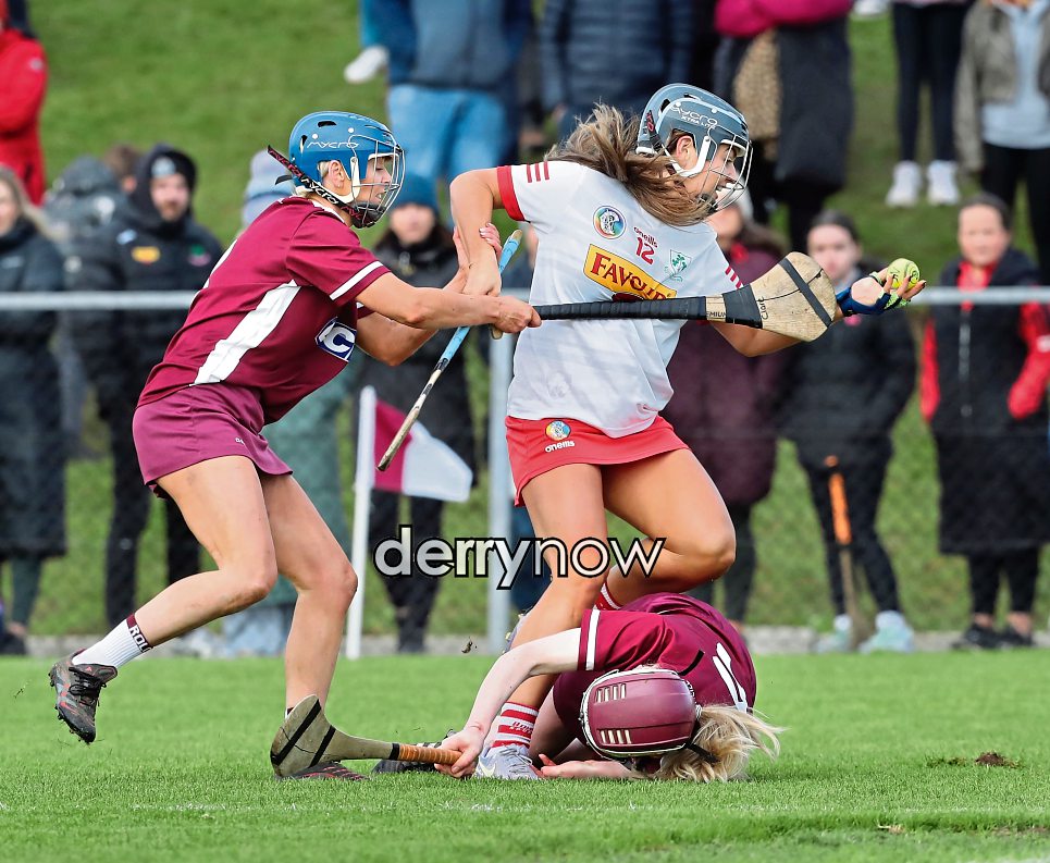 Slaughtneil Clare McGrath and Aoife Ni Chiaside with Katie McKillop of Loughgiel.