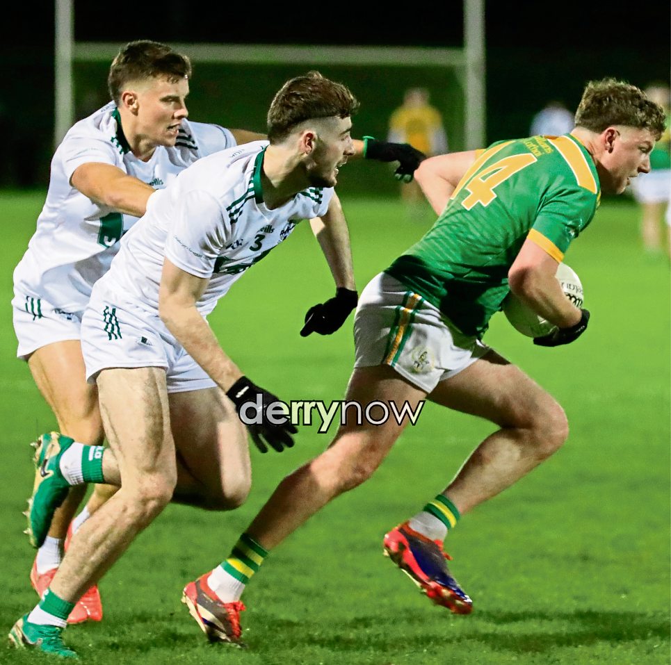 Dunloy’s Keelan Molloy holds on to the ball as he breaks away from Newbridge players in the 2025 Ulster Club Senior Football Round 1 at Owenbeg on Saturday. (Photos - Tom Heaney, nwpresspics)