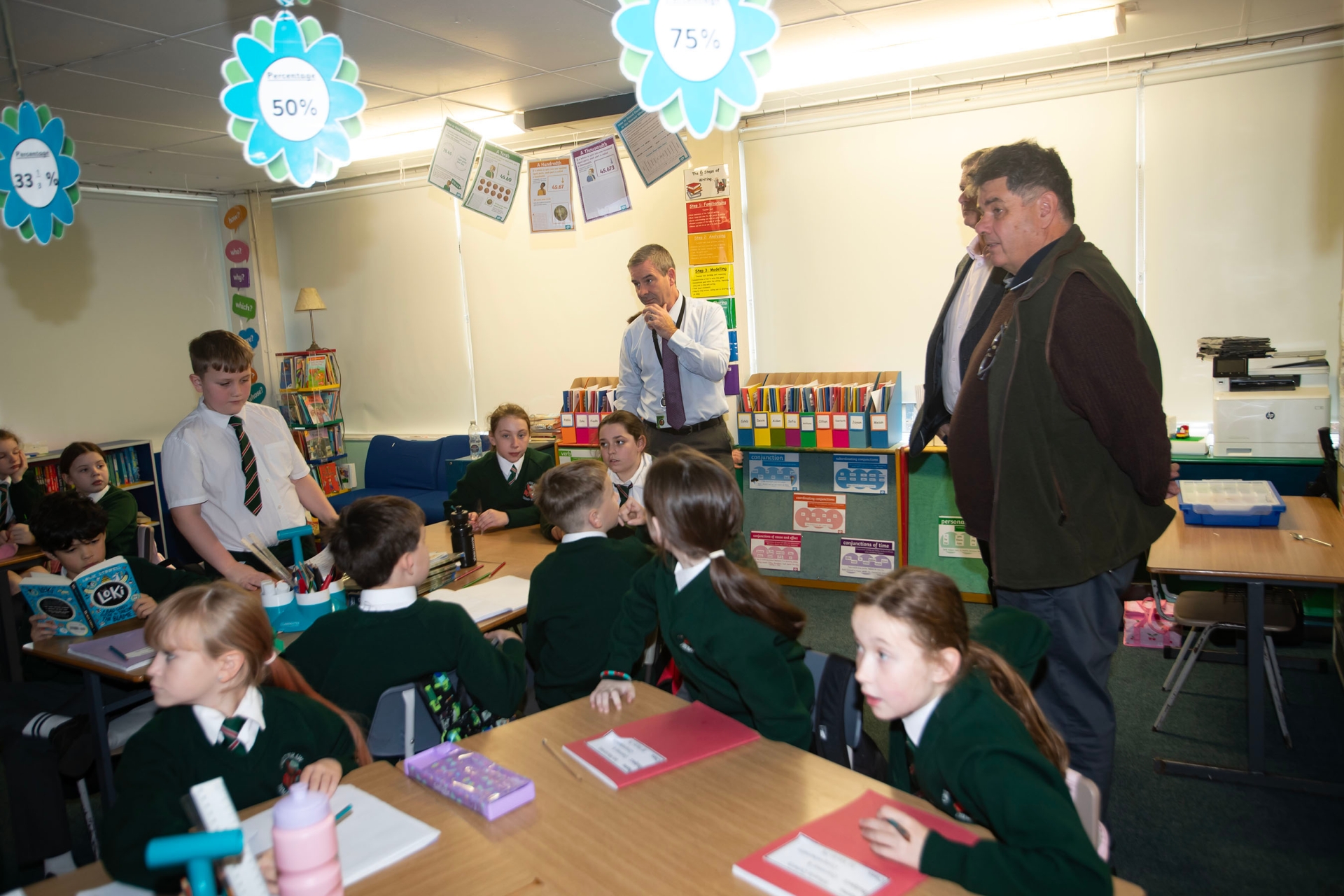 Mr. Shaun McLaughlin, Principal, Greenhaw PS pictured introducing the Coughlin brothers - David and Gareth to Mr. Christopher Martin's P6 class on Monday.