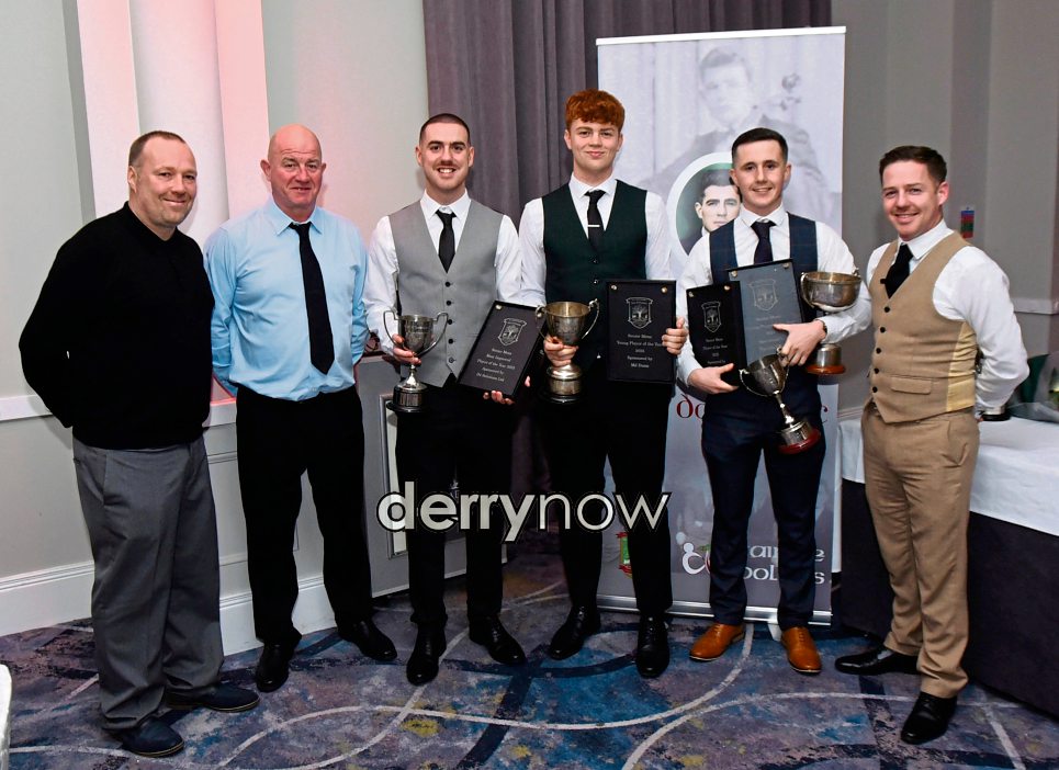 Senior Men- Most Committed - Paul Thompson, Young Player of the Year - Charlie Green and Players Player and Player of the Year - Ryan McGonigle, pictured with Oran Cassidy (far left), Jeffrey McGonigle and Peter Nixon.