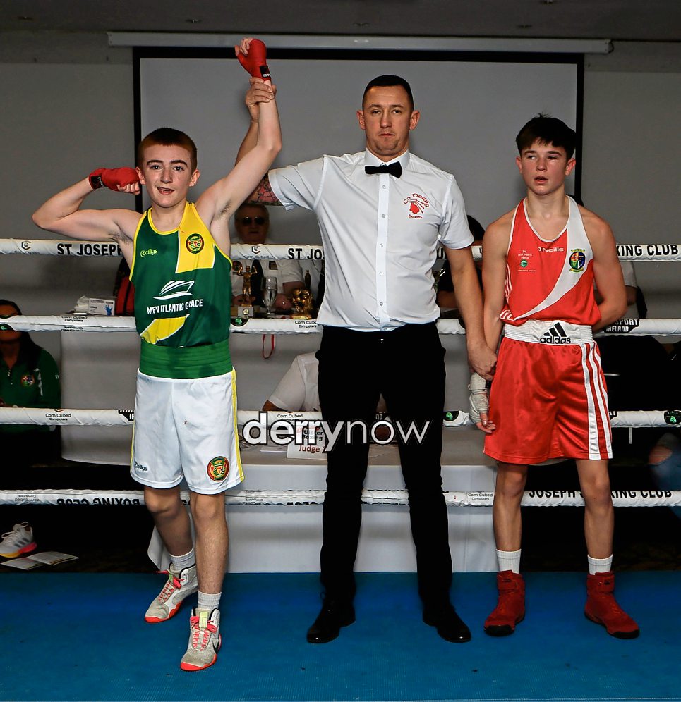Referee Rory McCallion raises the hand of Raphoe boxer Tyler Keaveney, winner of his bout against Charlie O'Donnell at the Inter County Amateur Boxing Tournament, Derry v Donegal held in the Maldron Hotel on Saturday night. (Photos - Tom Heaney, nwpresspics)