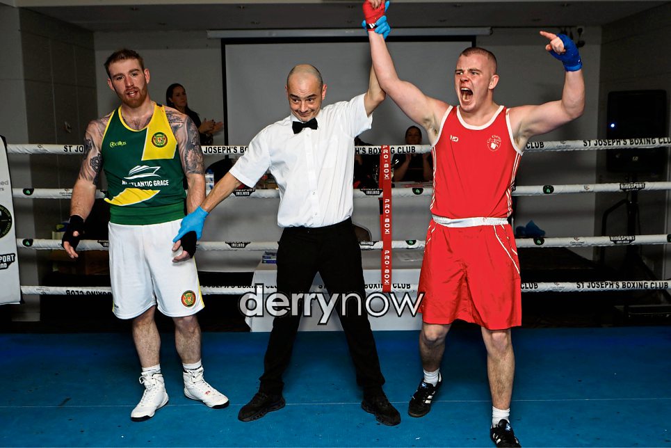 An exuberant Coady Peoples lifts his arms in triumph after defeating Leterkenny boxer Sean Boyle. Included is Eugene O'Kane, referee.