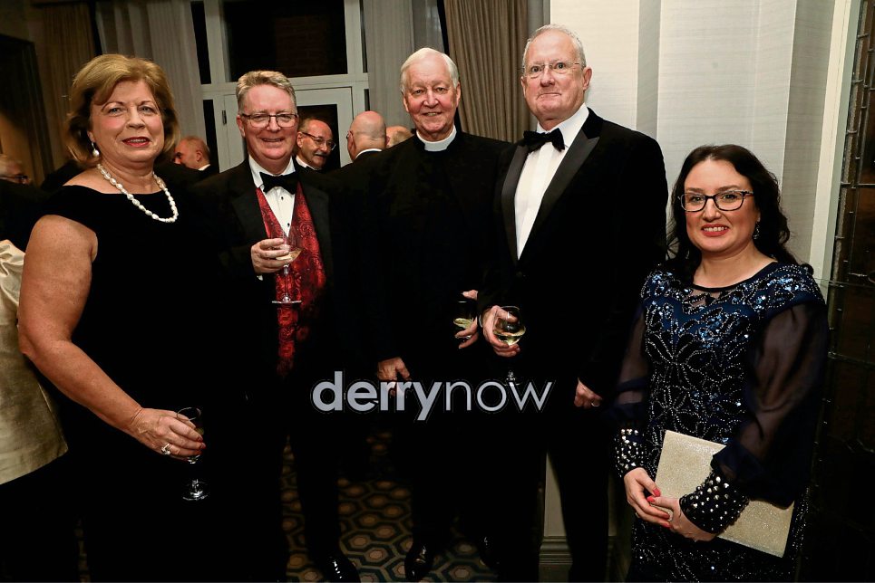 Caroline McLaughlin, principal, St. Columb's College, with from left, Dr. Catherine O'Mullan, NWRC, Simon Ward, Fr. Eamon McDevitt and Gareth Gallagher at the St. Columb's College Union annual dinner.