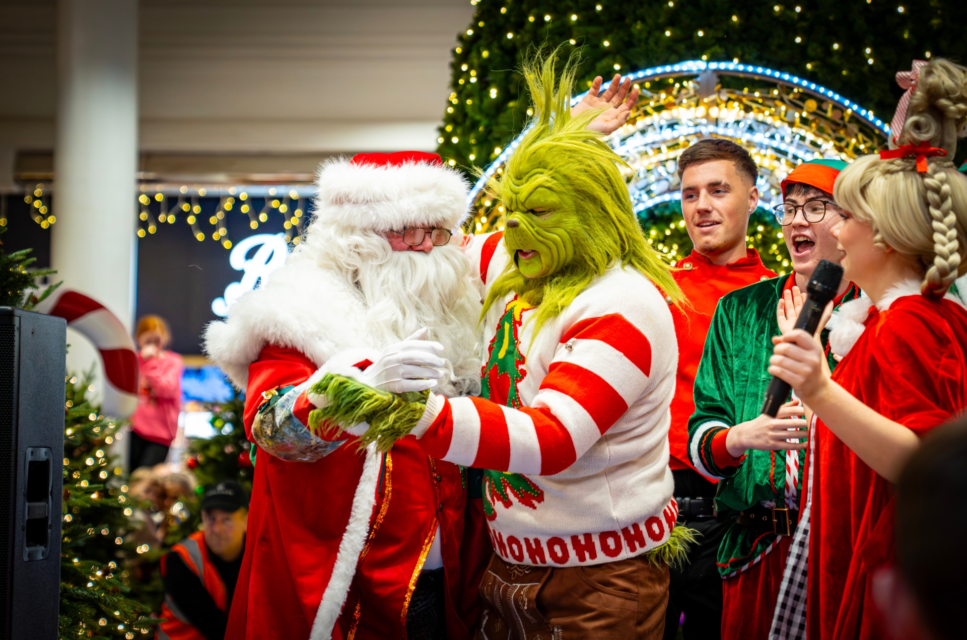 Santa and the Grinch switch on the Christmas lights. (Photo Credit: Aodhan Roberts)
