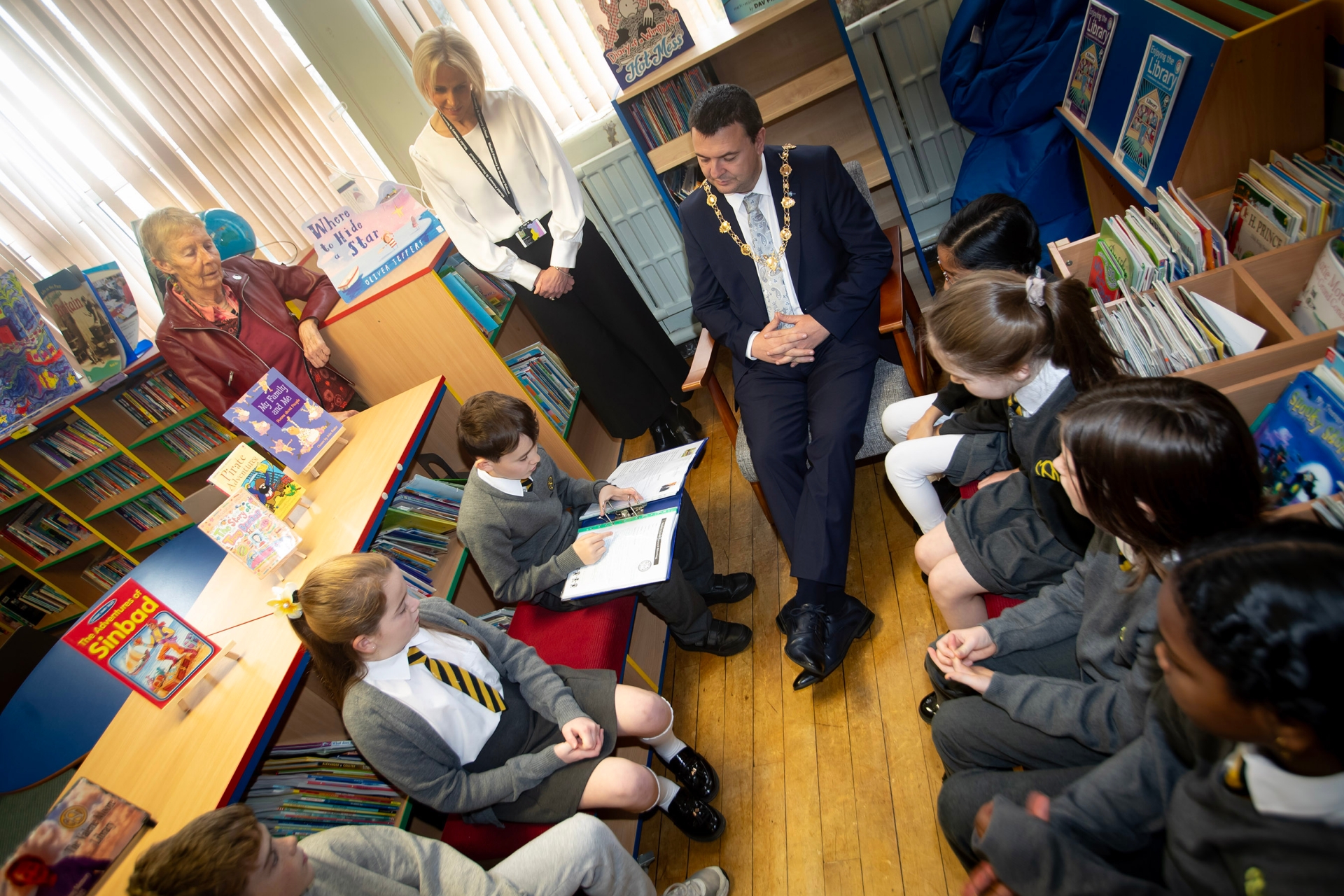 The student council in conversation with the Mayor, Ruairi McHugh, during his visit to the school last week to hand over the 'Anti-Racism Charter.'
