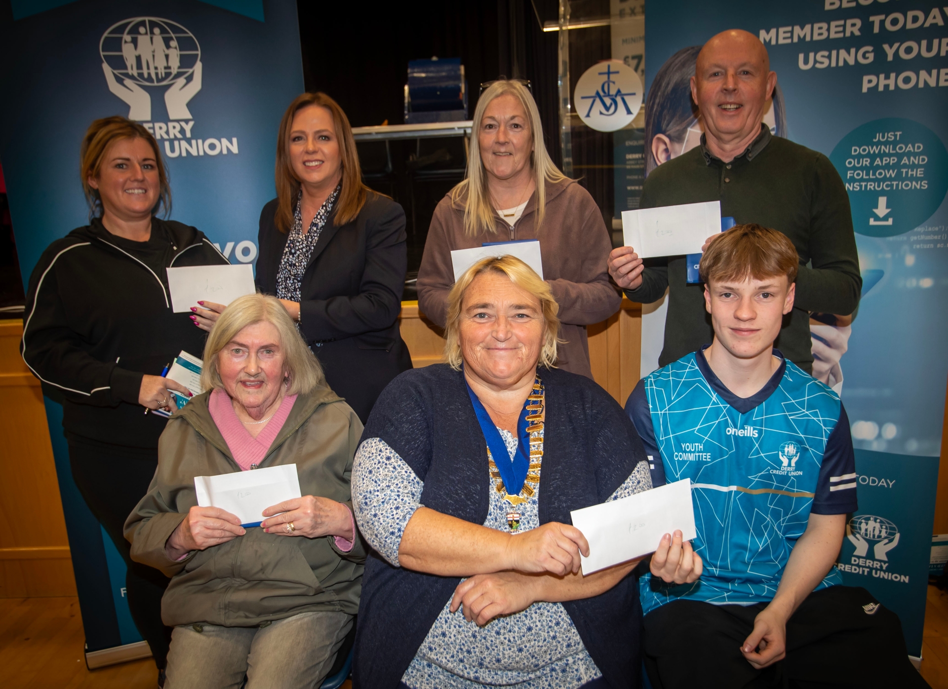 Prizewinners pictured at Monday night's Derry Credit Union AGM in St. Mary's College, Derry.