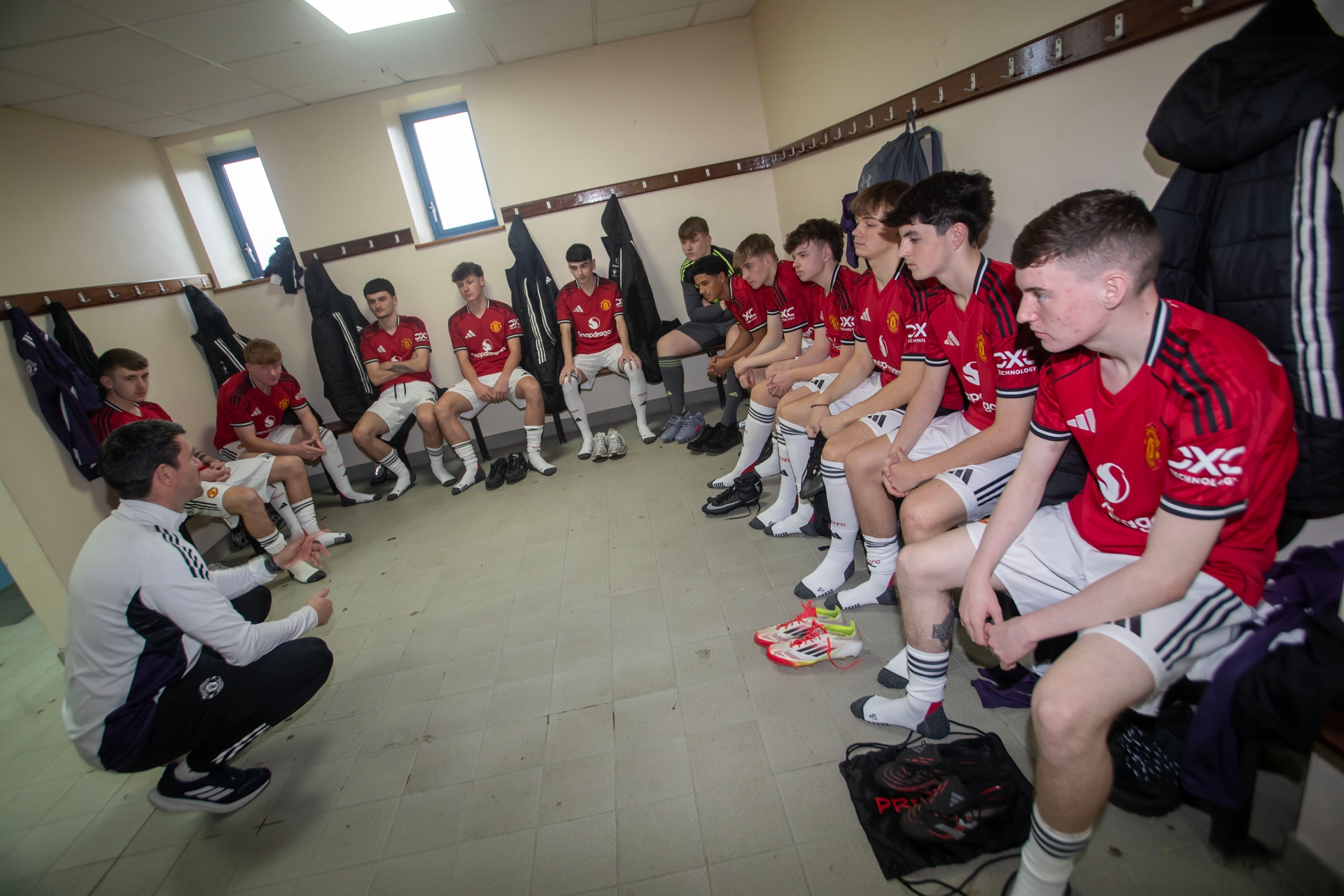 Mr. Declan Lynch, Manchester United Foundation BTEC Football Coach, giving a team talk to the Foundation team at St. Joseph's Boys School last week. (Photos: Jim McCafferty Photography)