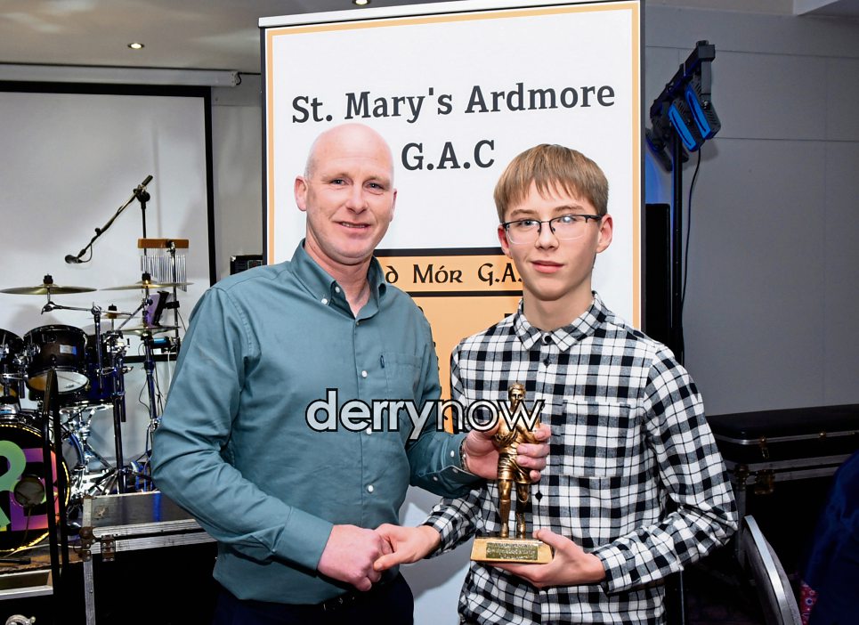 U14 Boys Joint Most Improved Player is presented to Ollie Higgins by William McLaughlin.