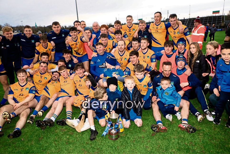 Burt players celebrating winning the Junior Hurling final, against Lavey in Celtic Park on Saturday.
