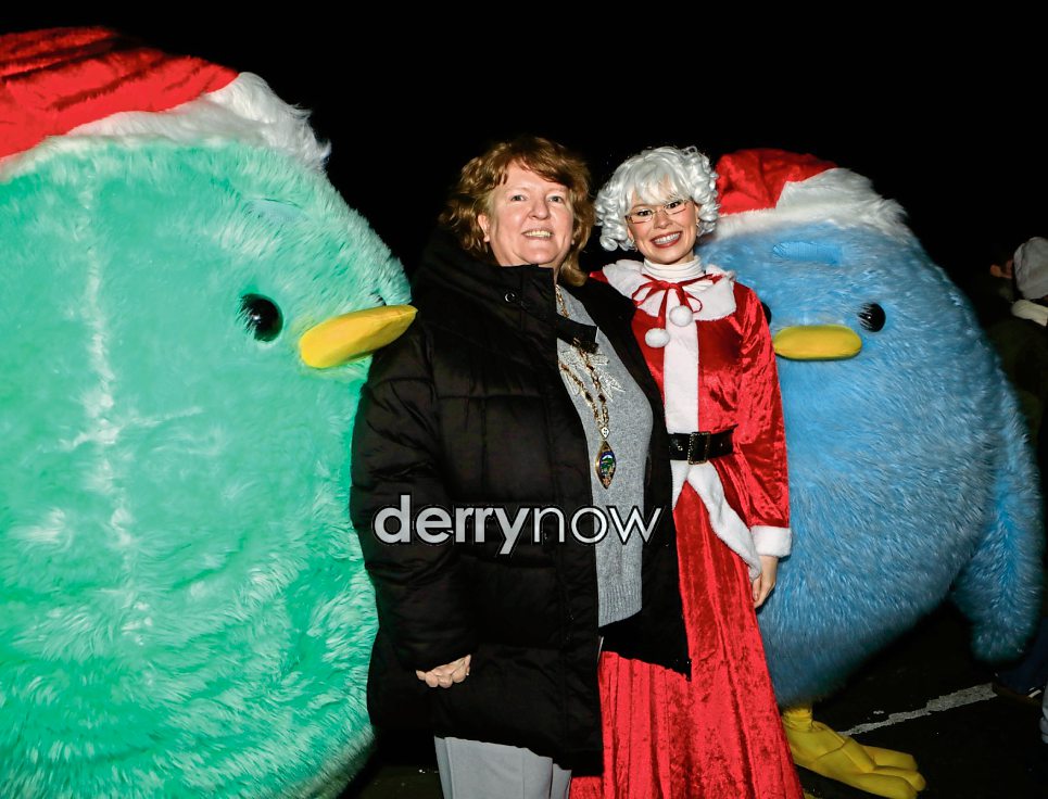 Deputy Mayor Niree McMorris, Mrs. Clause, Green and Blue Birds at the Culmore Community Partnership’s “Elf Parade and Christmas lights switch-on” at the Culmore Community Hub.