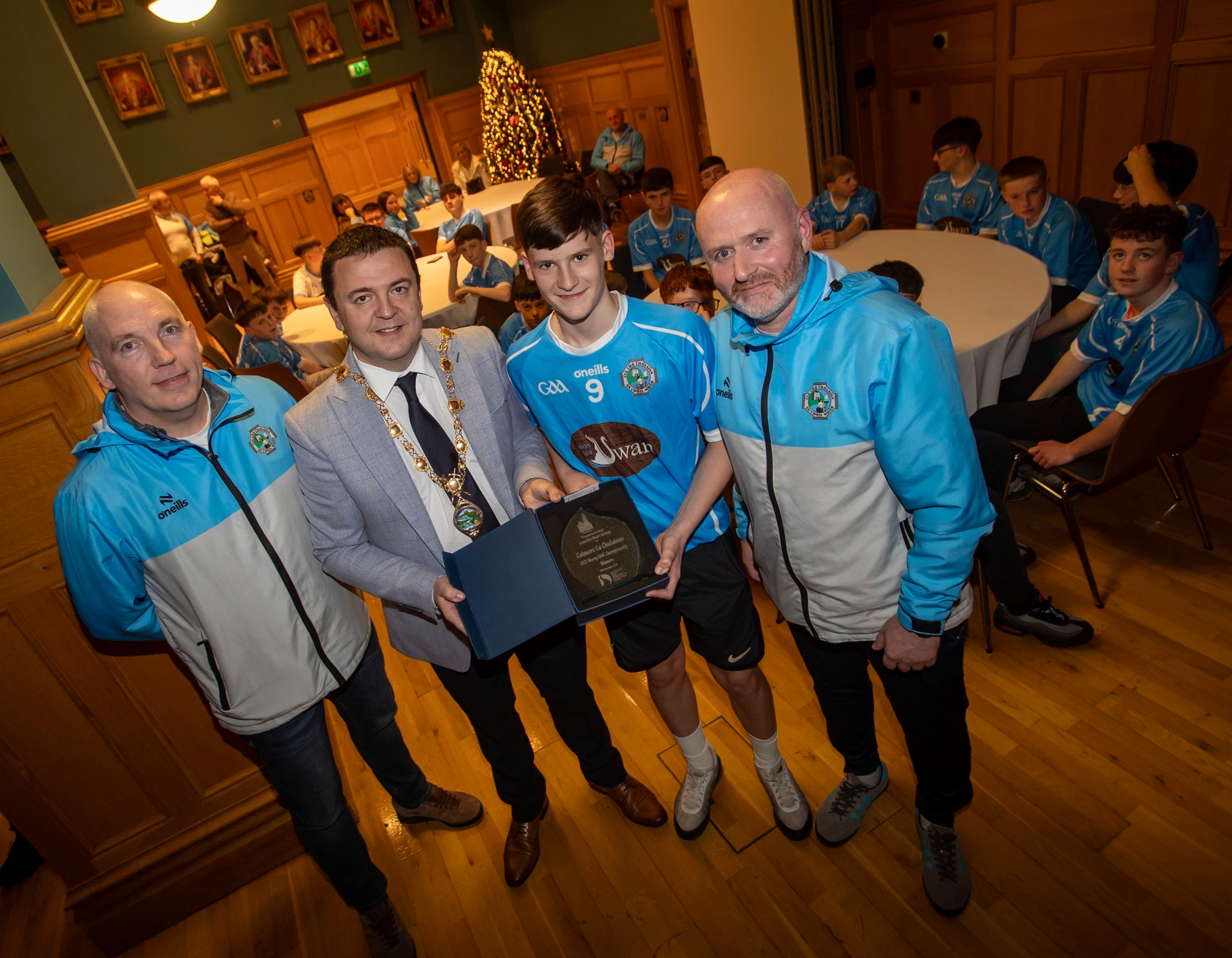 Mayor of Derry City and Strabane District Council, Ruairi McHugh, making a special presentation to the captain of Culmore Cu Chulainns GAC u-14 team at Wednesday evening's Mayoral Reception in honour of the club's-14 team who won the 2025 Derry u14C Championship recently. Included are managers Michael McLoone and Kieran Deery. (Photos: Jim McCafferty Photography)